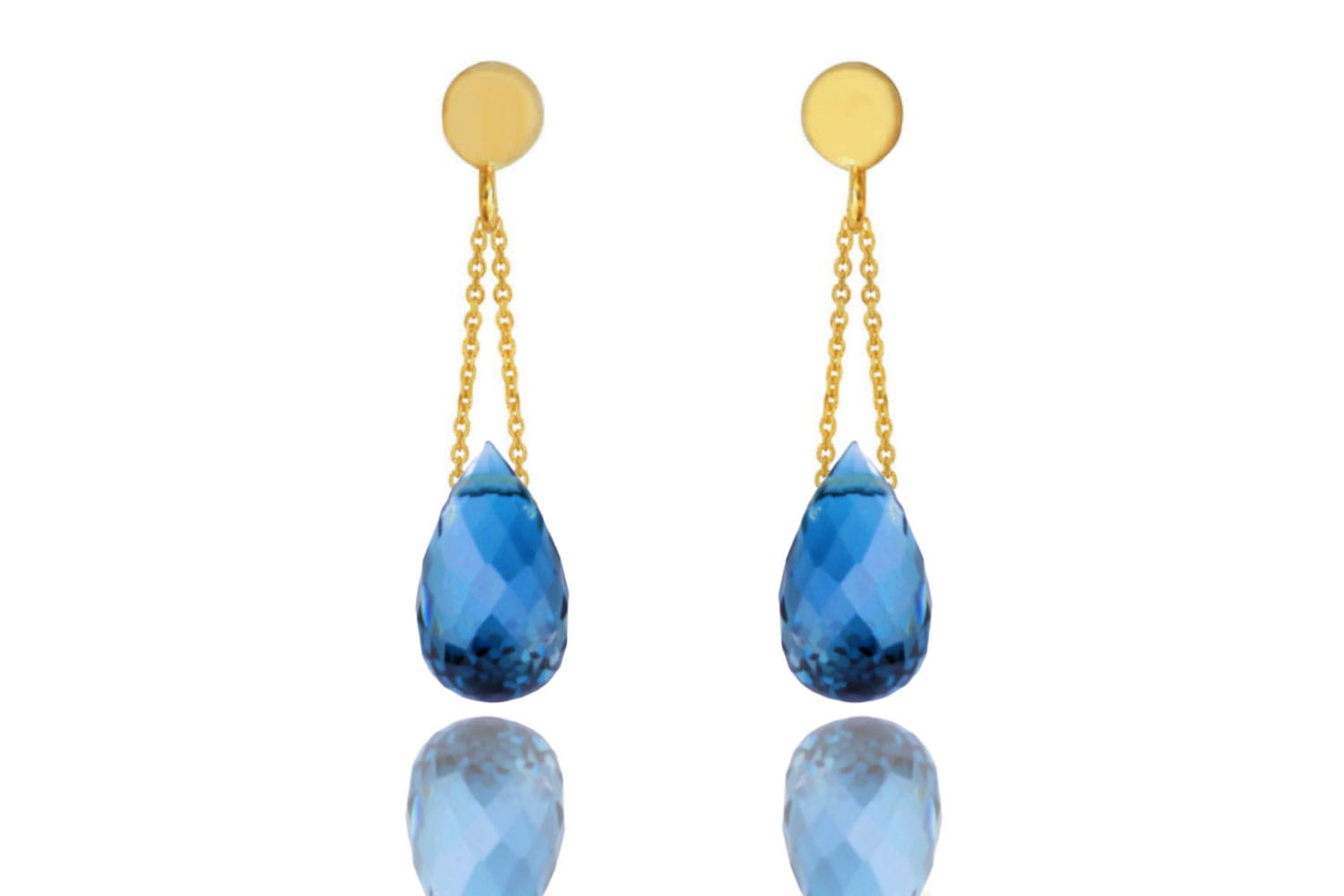 Kolczyki wykonane są z najwyższej jakości złota próby 585 i starannie wyselekcjonowanego topazu London Blue. Wielkość kamienia to 1 cm, a długość łańcuszka wynosi 2 cm.