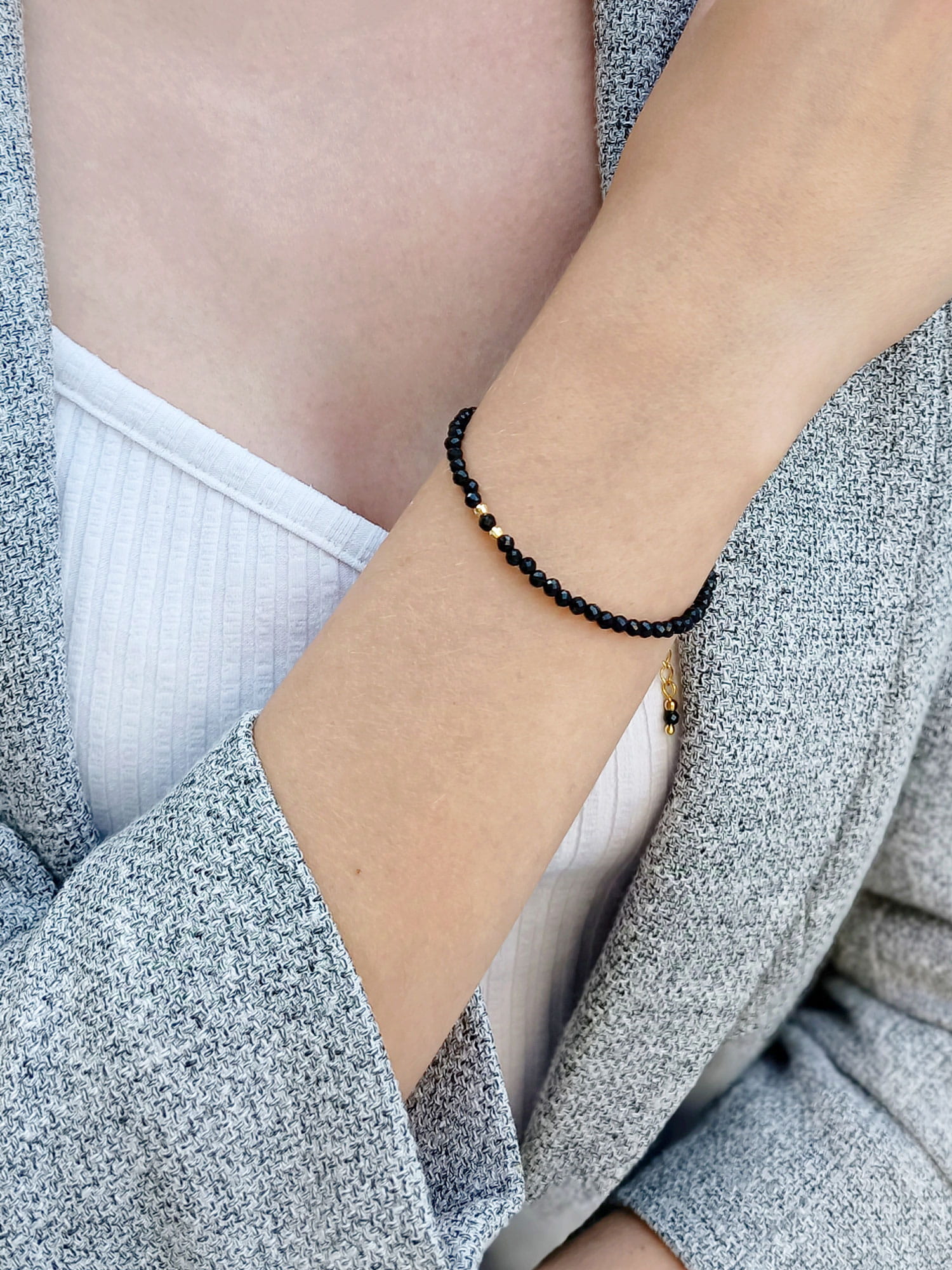 Poczuj niezwykłą, ochronną energię, jaką emanuje czarny turmalin. Nasza wyjątkowa, ręcznie wykonana bransoletka z turmalinem to coś więcej niż elegancka biżuteria. To osobisty talizman, który wzmacnia pewność siebie i pomaga stawiać czoła codziennym wyzwaniom. Subtelny blask fasetowanych kamieni (3 mm), połączony z możliwością regulacji (14 cm + 3 cm przedłużka), sprawia, że bransoletka idealnie dopasuje się do Twojego nadgarstka. Aby stworzyć harmonijny komplet ochronnej biżuterii, do bransoletki możesz dobrać idealnie pasujący naszyjnik z czarnego turmalinu lub wybrać od razu gotowy zestaw, łączący moc obu tych elementów.