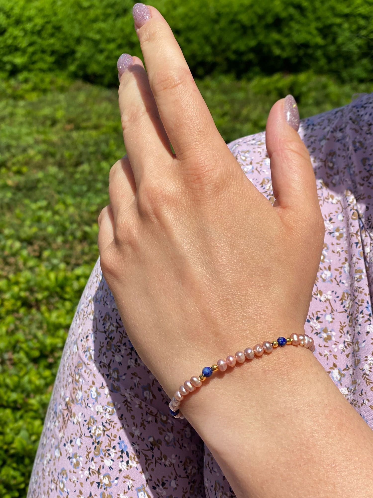 Lekko owalne, różowe perły o jedwabistym połysku, symbolizujące niewinność i kobiecość, przeplatają się z fasetowanymi kuleczkami lapisu lazuli, kamienia prawdy i duchowej wiedzy. To połączenie tworzy harmonijną kompozycję, która podkreśli Twój indywidualny styl i doda Ci pewności siebie. Srebrne lub złocone akcenty subtelnie rozświetlają całość, nadając bransoletce wyjątkowego charakteru. Bransoletka została wykonana na trwałej lince jubilerskiej, a regulowane zapięcie z przedłużką (14 cm + 4cm) pozwala na idealne dopasowanie do nadgarstka. Możesz też zamówić bransoletkę na indywidualny rozmiar – wystarczy wpisać go w "Uwagach do zamówienia".