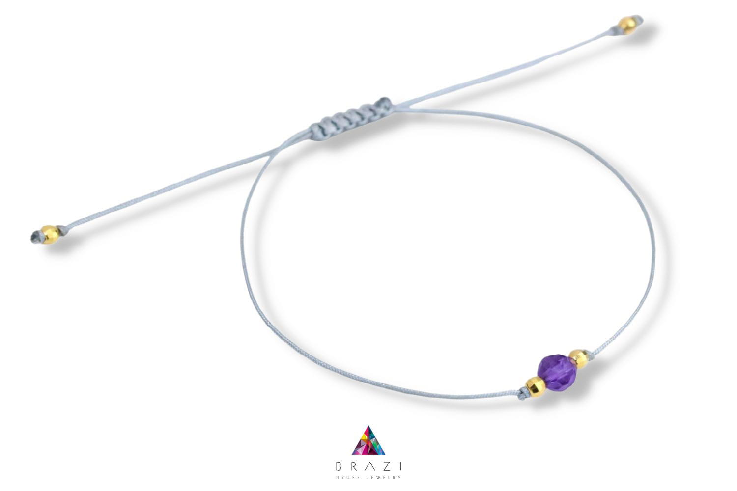 Pozwól, by subtelna elegancja bransoletki z ametystem otuliła Twój nadgarstek, dodając Ci blasku i harmonii. Ta minimalistyczna, ręcznie wykonana biżuteria to połączenie wysokiej jakości szarego, nylonowego sznurka z fasetowaną kulą ametystu o głębokim, fioletowym odcieniu. To idealny dodatek na co dzień, który podkreśli Twój indywidualny styl i doda Ci pewności siebie.