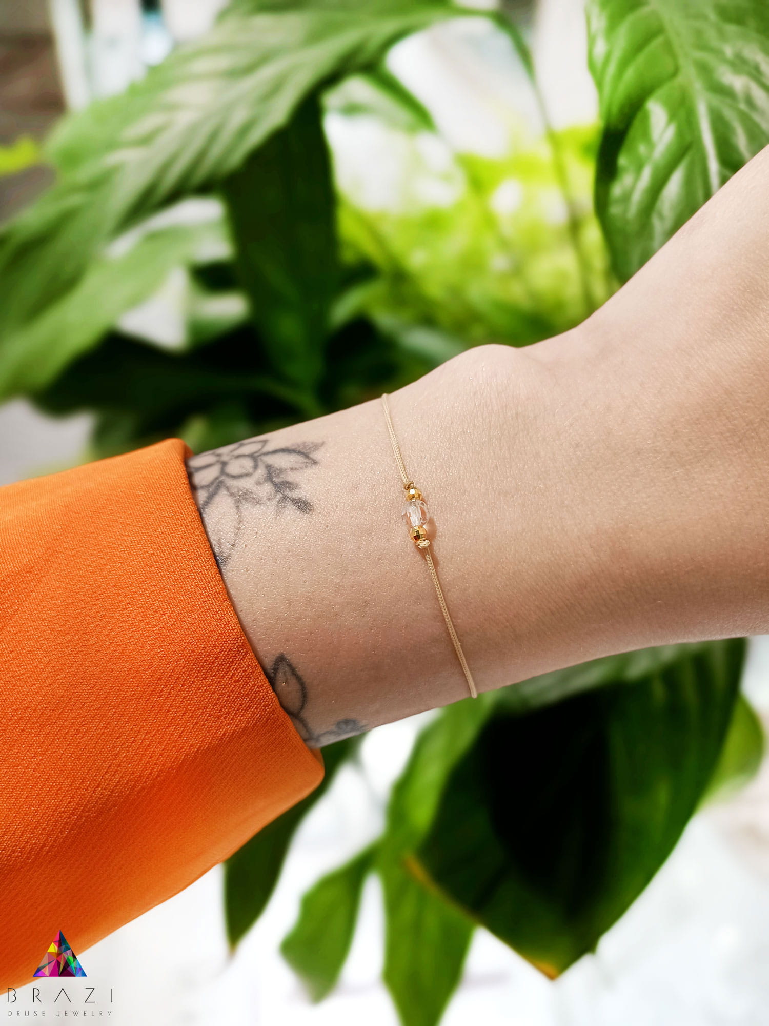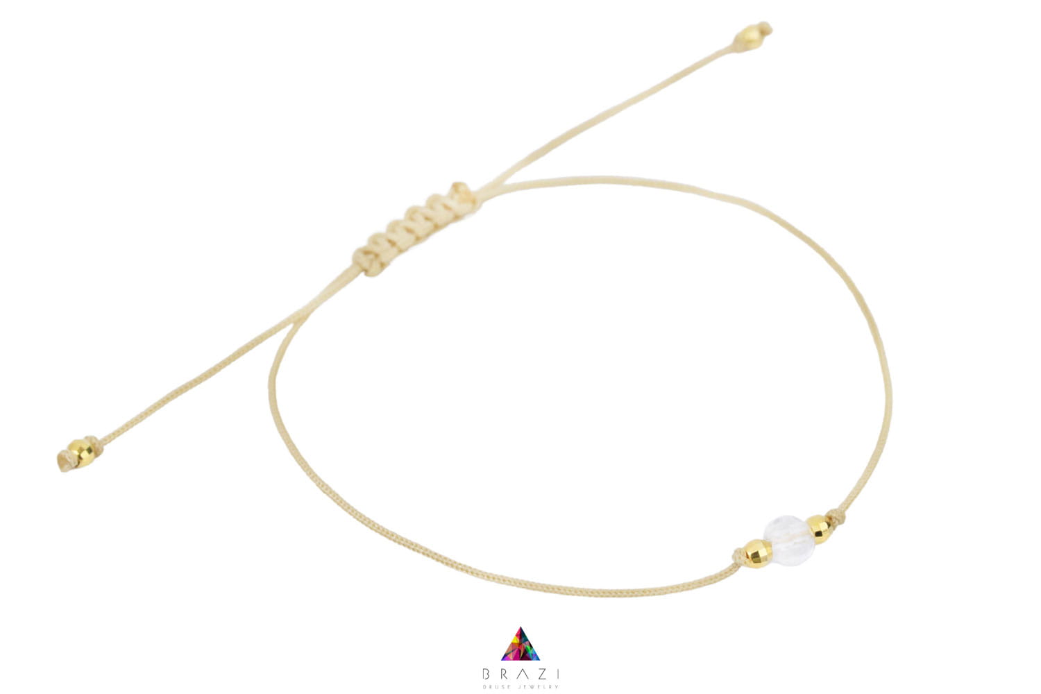 Odkryj subtelny urok bransoletki szczęścia wykonanej z fasetowanych kulek kryształu górskiego, nawleczonych na delikatny, beżowy sznurek nylonowy. To więcej niż biżuteria – to talizman, który otuli Cię pozytywną energią i doda blasku Twojemu stylowi.