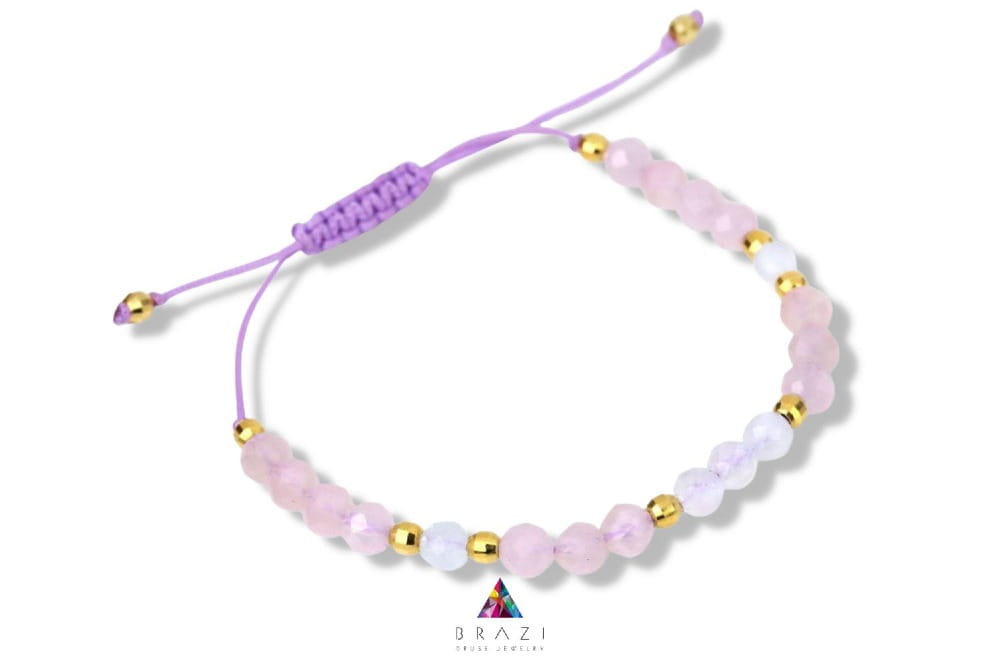 Delikatne, fasetowane kuleczki kwarcu różowego i kamienia księżycowego, o wielkości ok. 3 mm, subtelnie mienią się w świetle, tworząc piękny kontrast z liliowym sznurkiem. Regulowane zapięcie makramowe pozwala idealnie dopasować bransoletkę do Twojego nadgarstka, zapewniając komfort noszenia przez cały dzień. Ta bransoletka to doskonały dodatek na każdą okazję, a także wyjątkowy pomysł na prezent dla bliskiej osoby.