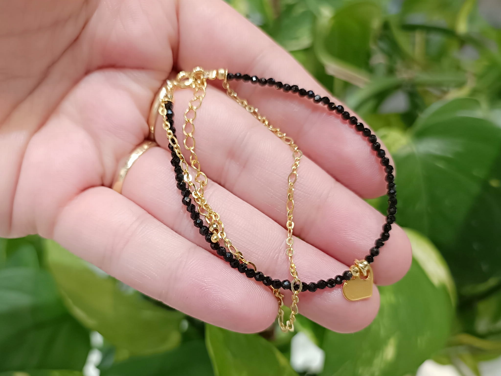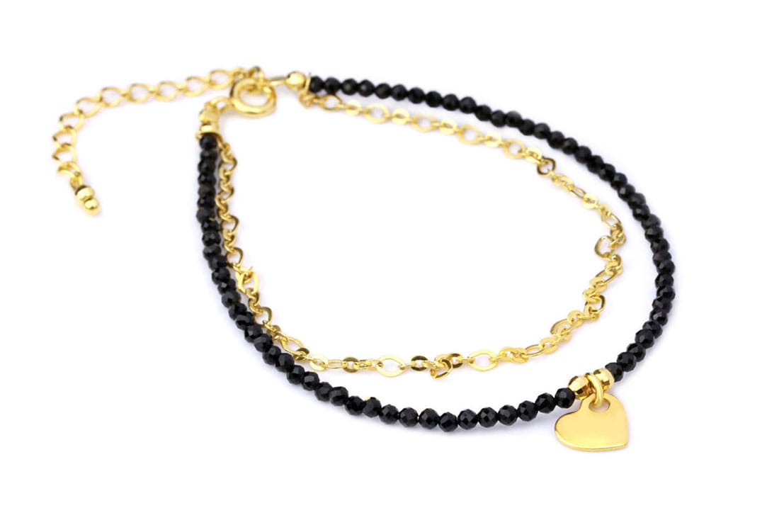 Czarny turmalin, znany ze swoich właściwości ochronnych, transformuje negatywną energię, pomagając Ci zachować spokój i równowagę. Jego głęboka, czarna barwa w połączeniu z delikatnym blaskiem fasetowanych kulek tworzy hipnotyzujący efekt, który przyciąga wzrok. Subtelna zawieszka w kształcie serca dodaje bransoletce romantycznego akcentu, czyniąc ją idealnym prezentem dla bliskiej osoby lub wyjątkową ozdobą dla Ciebie.