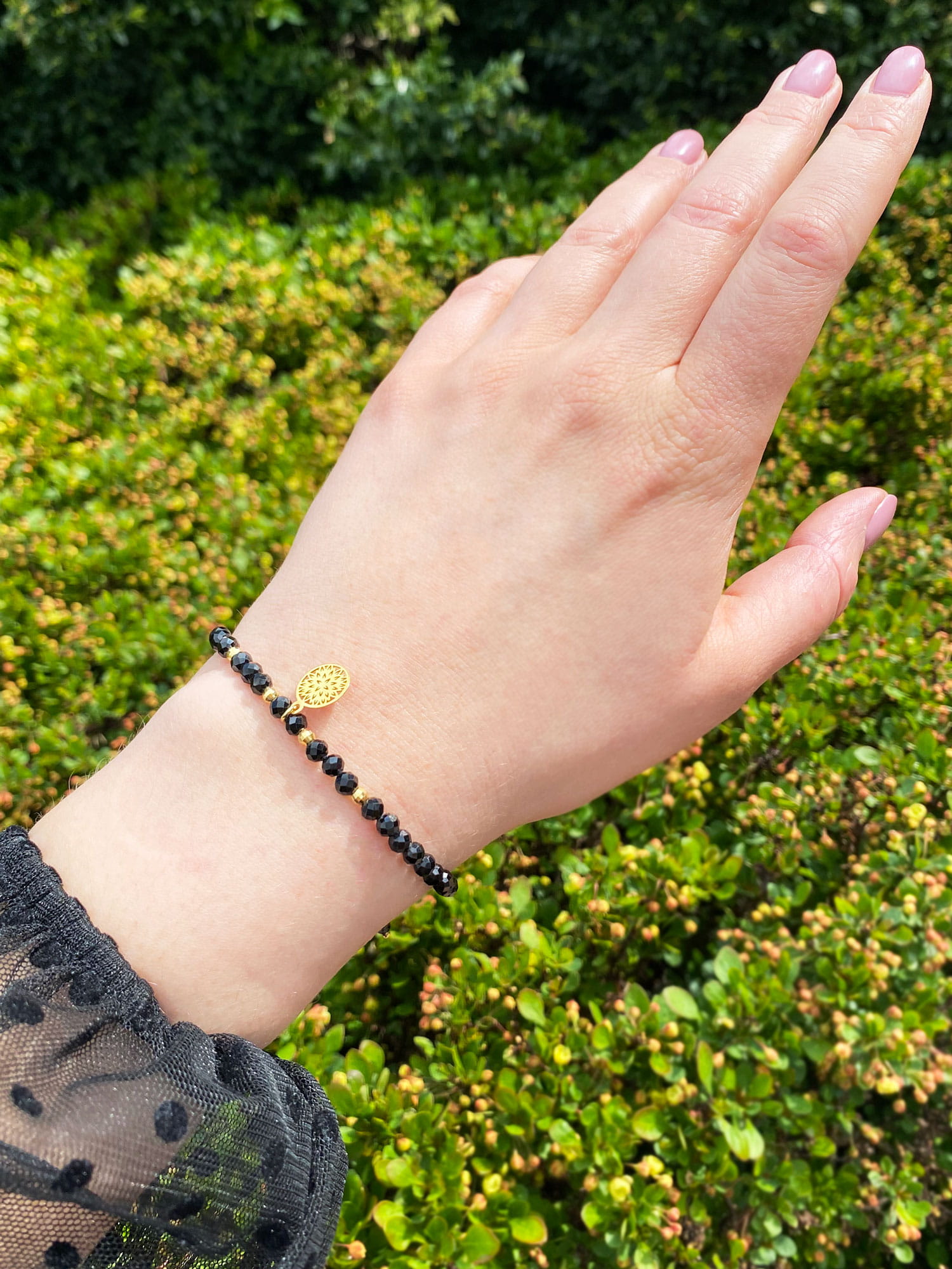 Zanurz się w głębokiej czerni eleganckiej bransoletki z fasetowanego turmalinu, ręcznie wykonanej z dbałością o każdy detal. Delikatne, mieniące się kulki turmalinu o średnicy 3 mm, połączone z wysokiej jakości linką jubilerską w kolorze złota lub srebra, tworzą harmonijną kompozycję, idealną dla miłośników subtelnej, a zarazem wyrazistej biżuterii.