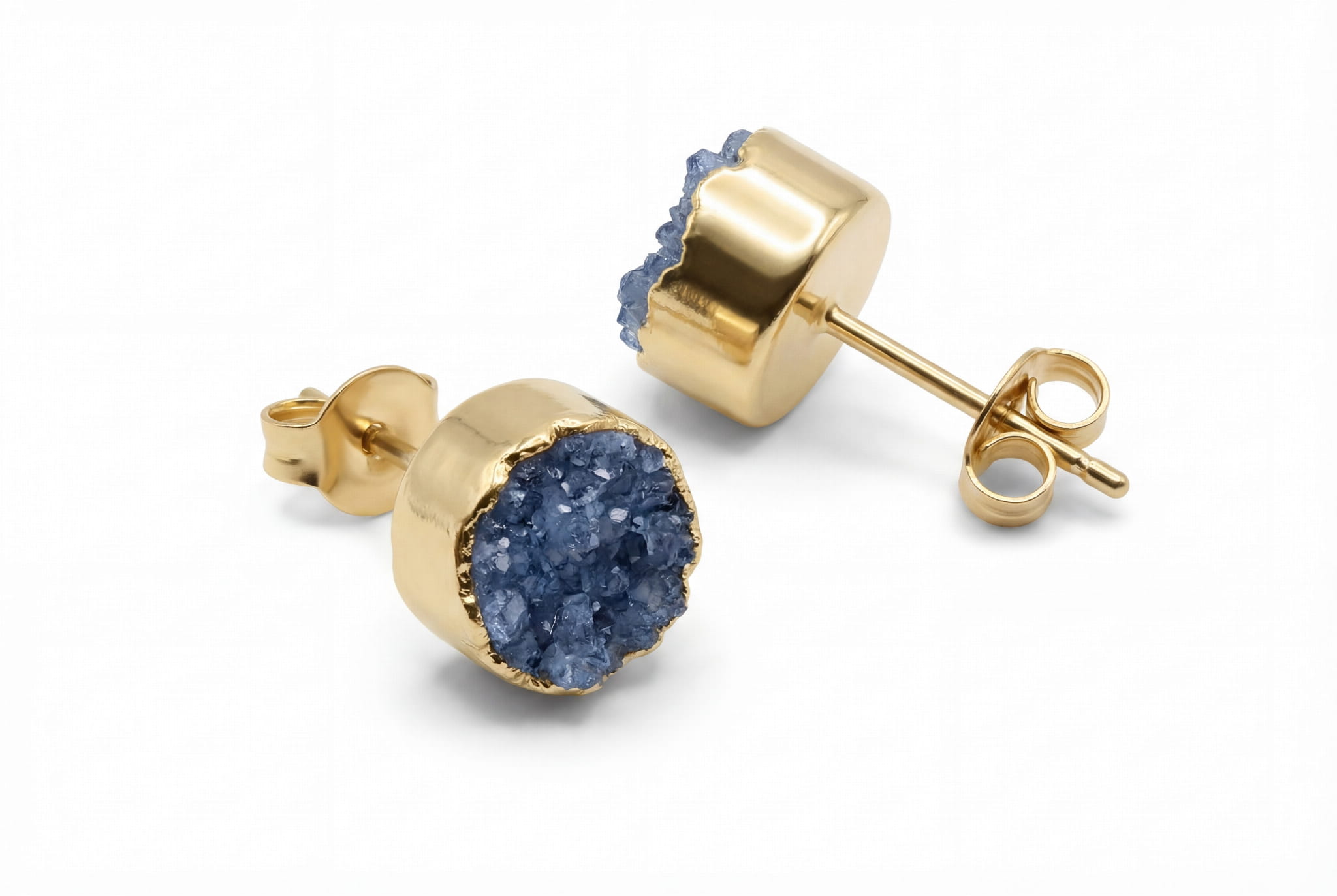 - Unikalna cecha: Naturalna, surowa struktura druzy; hipoalergiczny sztyft idealny dla osób uczulonych na srebro
