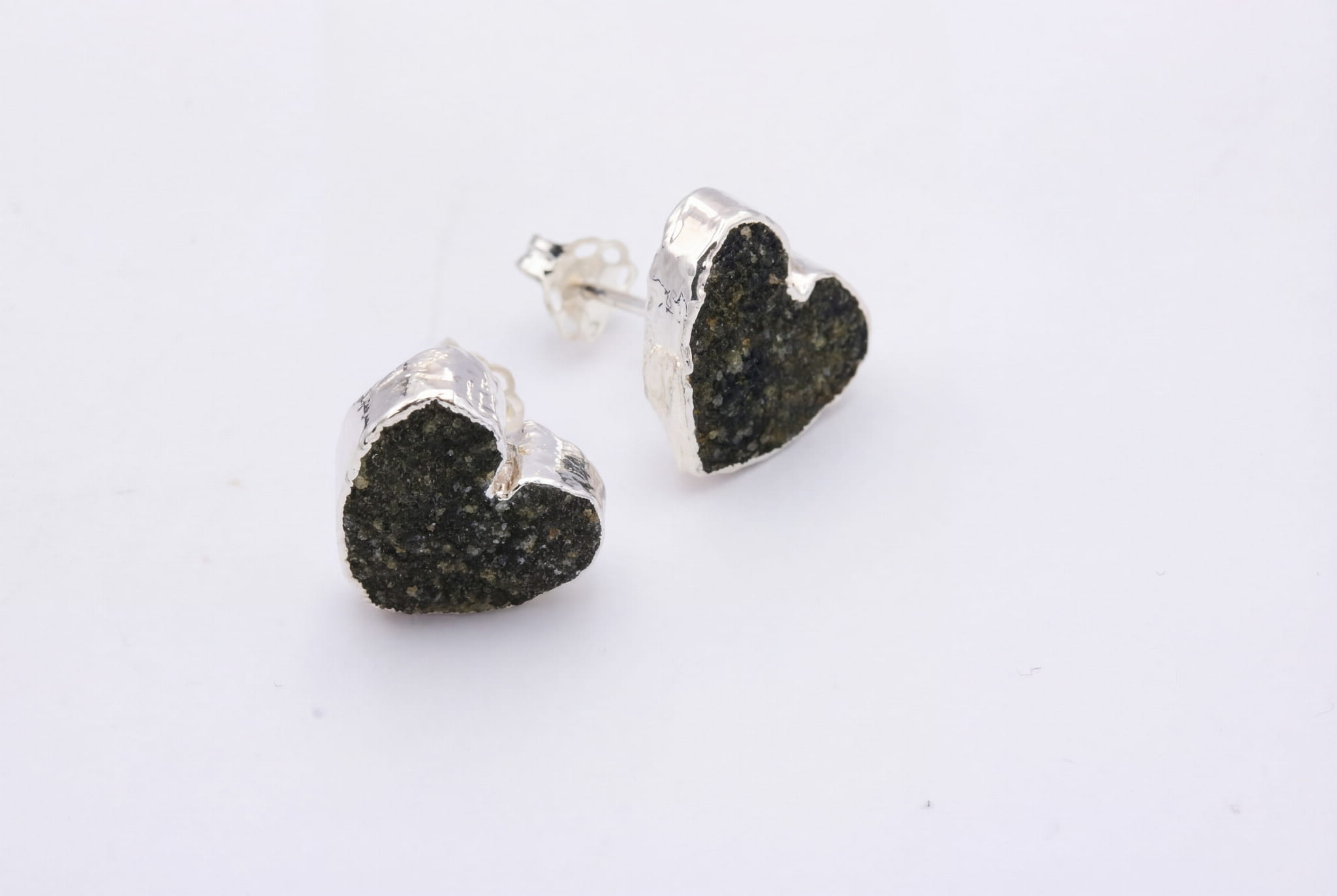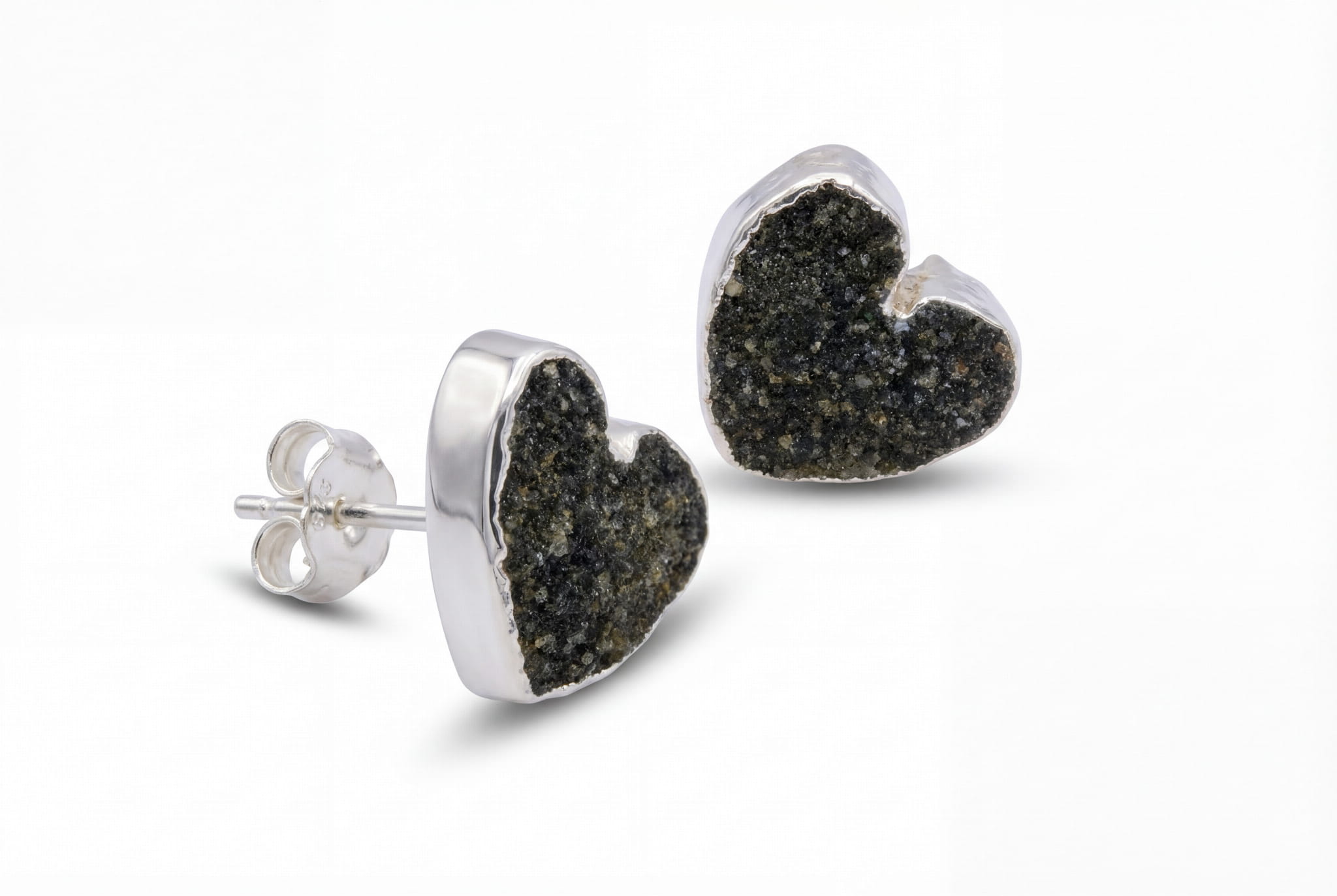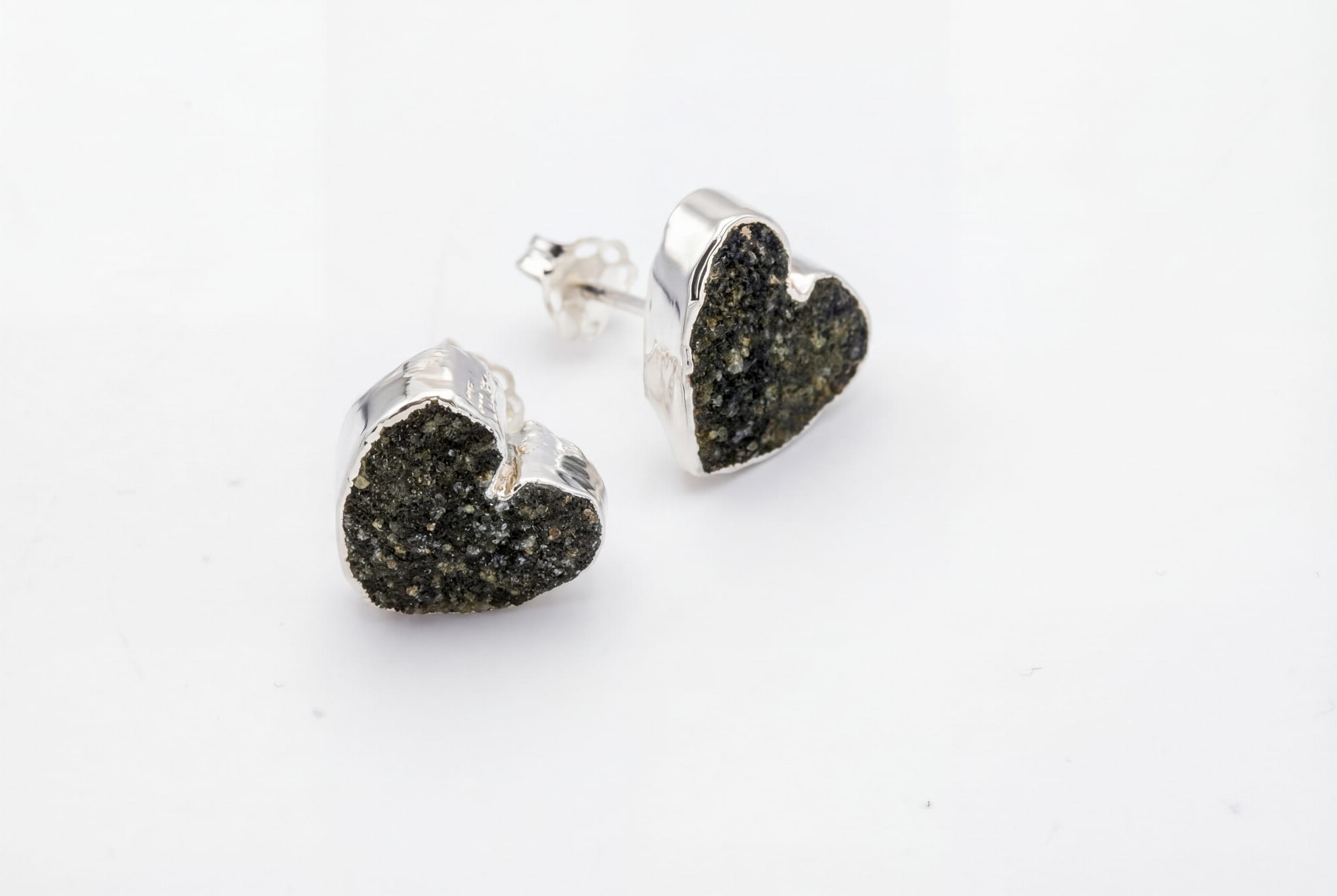 To biżuteria, która żyje najbliżej Ciebie. Tuż przy twarzy, te małe serca z czarnego agatu stają się świetlistym akcentem, który subtelnie rozjaśnia spojrzenie. Ich powierzchnia nie jest gładka – to druza, czyli tysiące mikroskopijnych, naturalnych kryształów, które razem tworzą hipnotyzującą mozaikę. Każdy ruch głowy sprawia, że łapią światło, mieniąc się dyskretnie niczym rozgwieżdżone niebo. Srebrzona oprawa otula surową formę kamienia, nadając jej szlachetnego charakteru i podkreślając jego organiczne piękno.