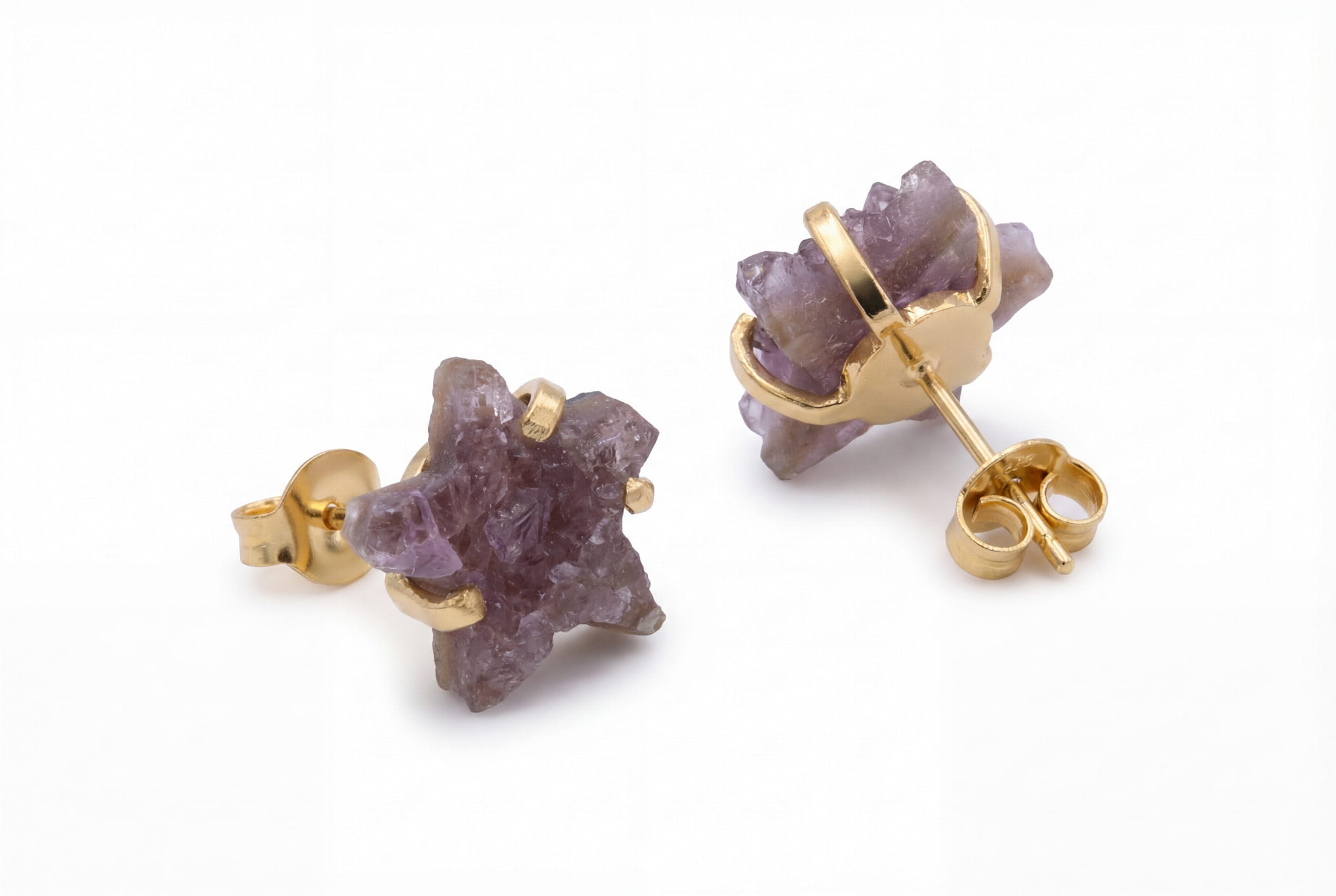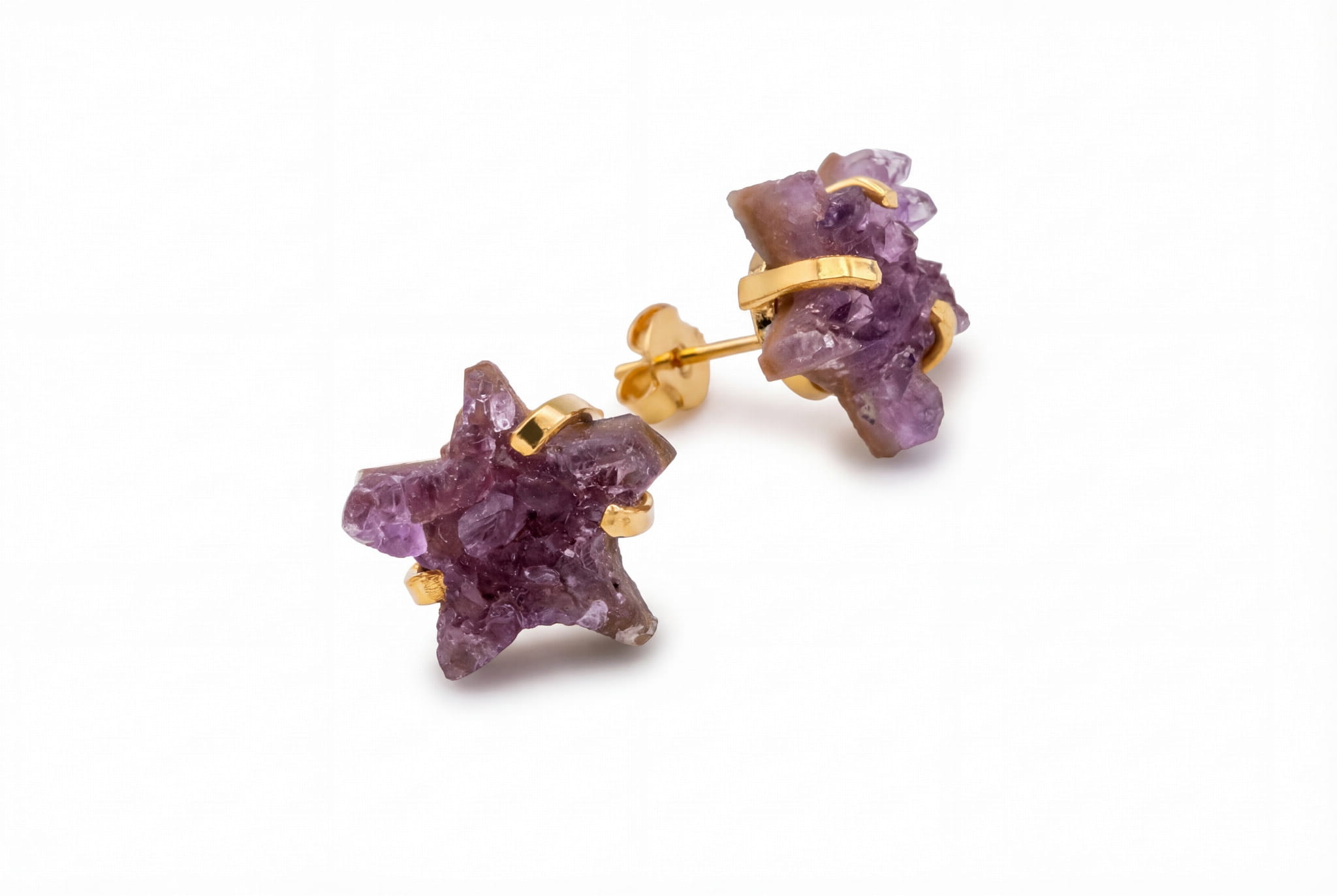 To nie są zwykłe kolczyki. To fragment natury, który możesz nosić blisko siebie. Każda gwiazdka została precyzyjnie wyrzeźbiona z naturalnej druzy ametystu, której powierzchnia mieni się tysiącem mikroskopijnych kryształków, niczym gwiezdny pył zamknięty w kamieniu. Ten niezwykły kamień, ametyst, pochodzi prosto z serca Brazylii, niosąc ze sobą energię tego miejsca. Ciepła, złocona oprawa otula go niczym koszyczek, subtelnie podkreślając jego głęboki, fioletowy kolor i surową strukturę.