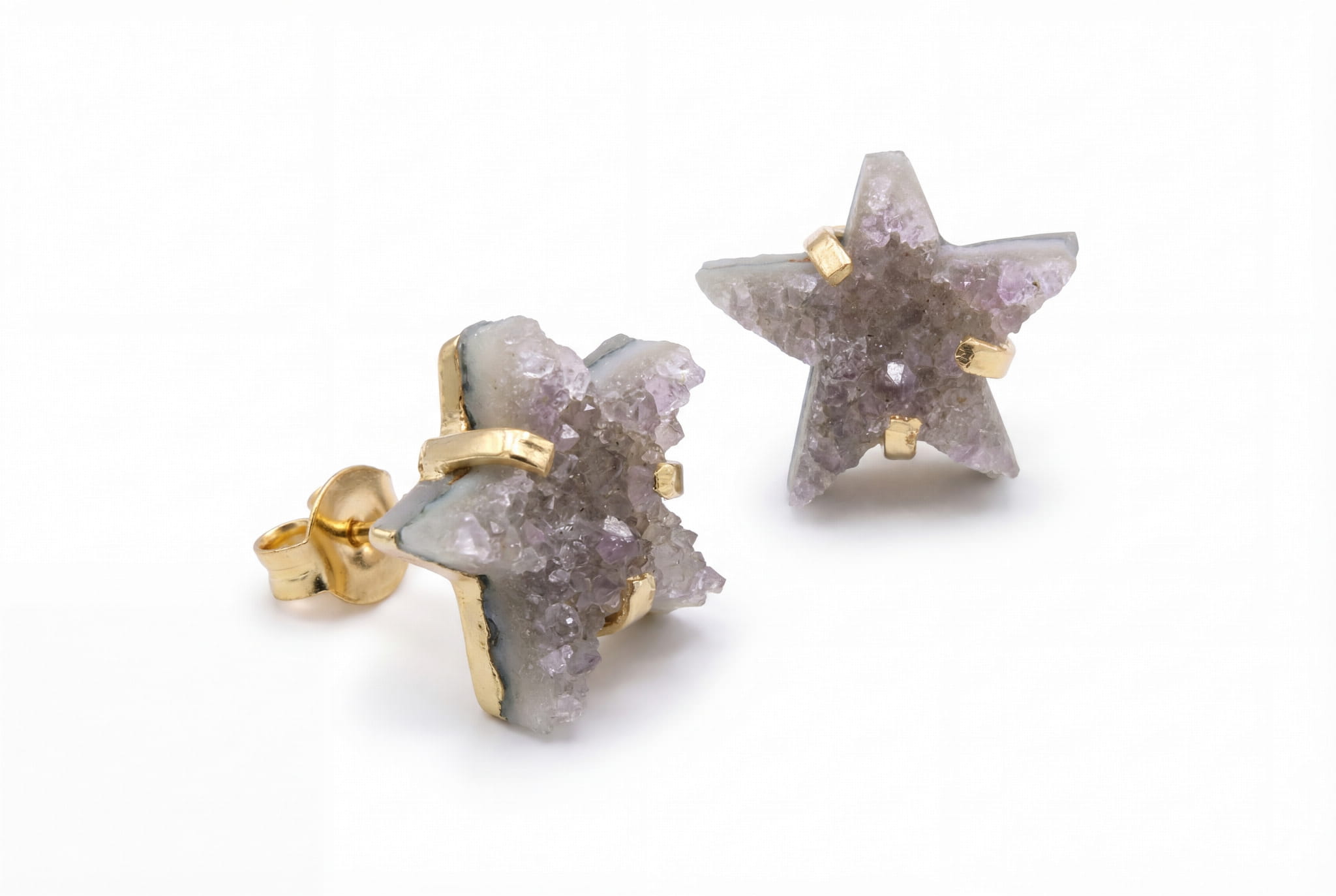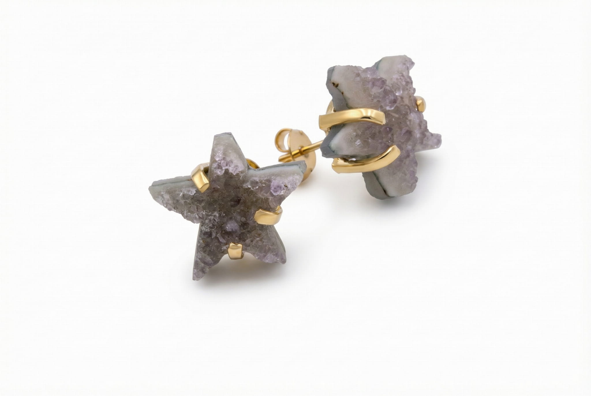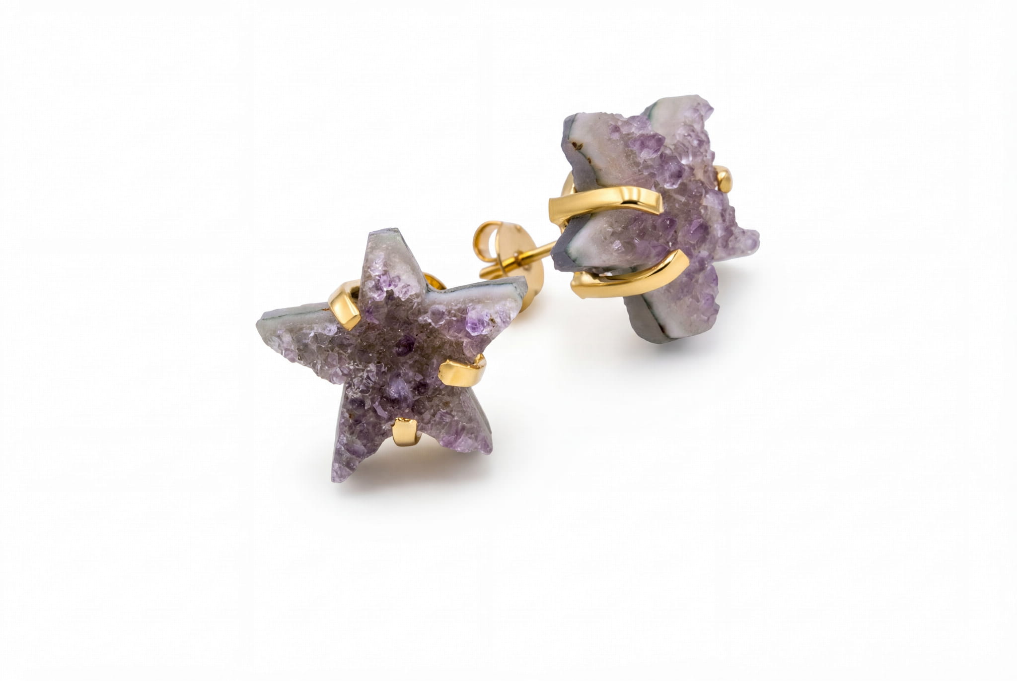 To nie są zwykłe kolczyki. To fragment gwiezdnego nieba, który możesz mieć zawsze przy sobie. Każda gwiazdka została precyzyjnie wyrzeźbiona z surowej druzy ametystu, dzięki czemu na jej powierzchni mienią się tysiące naturalnych mikrokryształków. Spójrz, jak subtelnie łapią światło, tworząc efekt roziskrzonego pyłu. To statyczne, uziemione piękno natury prosto z serca Brazylii, zamknięte w formie, która nigdy nie traci swojego blasku.