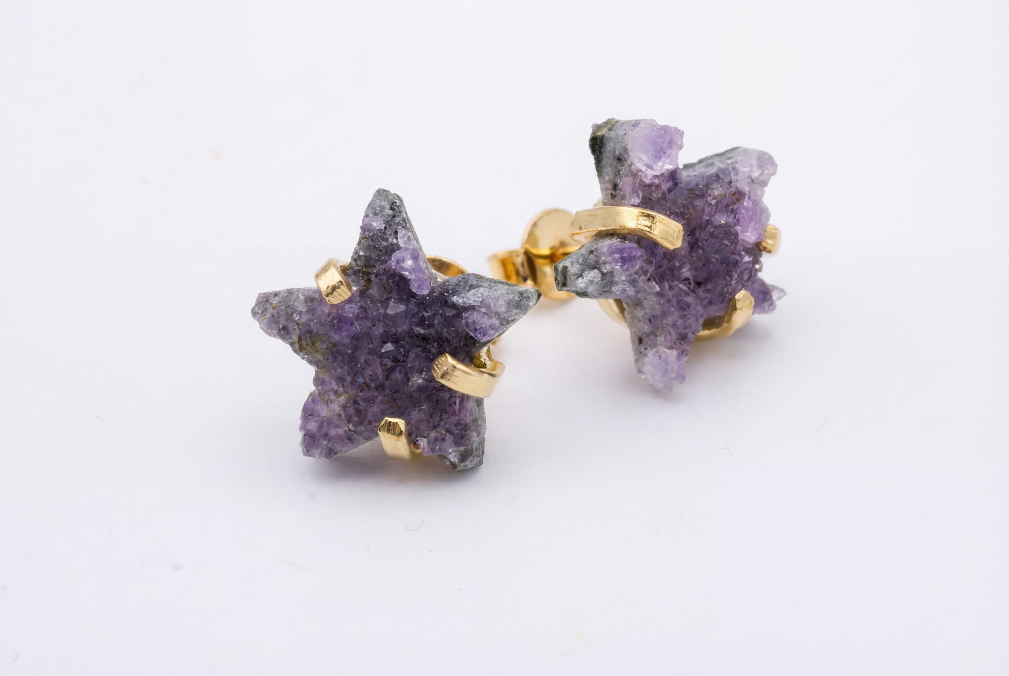 Kolczyki na sztyfcie to biżuteria najbliższa Tobie – subtelny, świetlisty akcent, który rozjaśnia spojrzenie. W tych kolczykach zamknęliśmy magię nocnego nieba. Każda gwiazdka została precyzyjnie wyrzeźbiona z większego kawałka brazylijskiej druzy ametystu, dzięki czemu jej powierzchnia mieni się setkami naturalnych, drobnych kryształków. Głęboki, fioletowy kolor, za który tak ceniony jest kamień ametyst, w tej surowej formie zyskuje niezwykłą, hipnotyzującą trójwymiarowość.