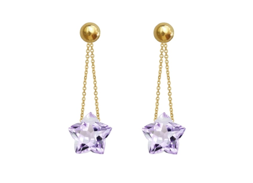 to minimalistyczna biżuteria, wykonana z najwyższej jakości kamienia i złota próby 585. Precyzyjny szlif wydobywa z ametystu jego niezwykły blask. Drobna, kamienna gwiazdka przewieszona na złotym łańcuszku, pięknie odbija światło kołysząc się przy każdym ruchu. Kolczyki tworzą subtelny dodatek zarówno na co dzień jak i na większe okazje. Zapięcie to standardowy sztyft. Do wyboru również wariant w srebrze próby 925 -sztyft i łańcuszek wykonany jest z wysokiej jakości srebra rodowanego, dzięki czemu nie ciemnieje i nie traci blasku.