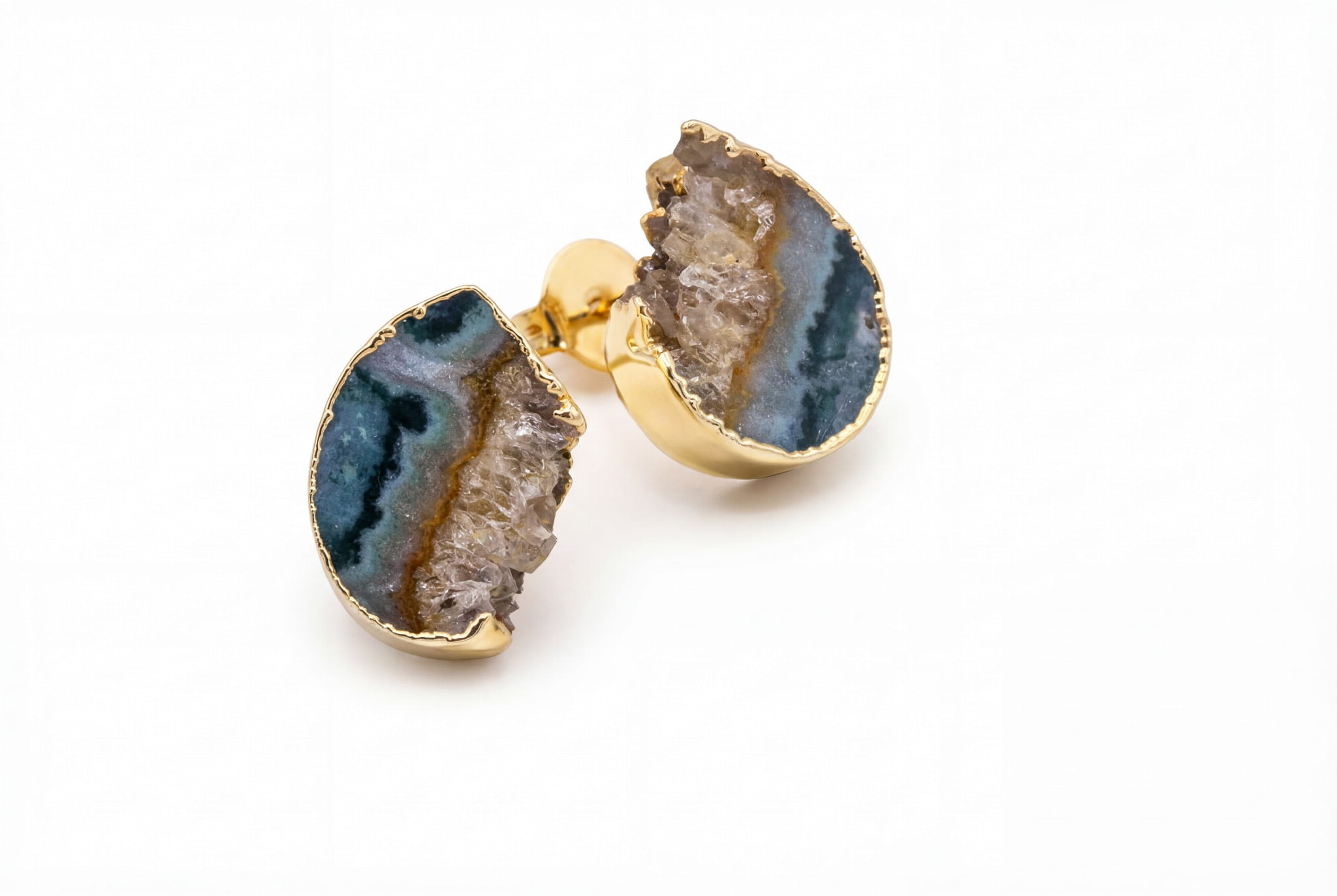 Każda para jest jedyna w swoim rodzaju, a jej nieregularne krawędzie zostały starannie oblane 24-karatowym złotem przez rzemieślników z naszej pracowni. Ten ciepły, złoty kontur podkreśla surowość minerału, tworząc biżuterię z kamieni o niezwykłej elegancji. Dzięki formie sztyftu są niezwykle wygodne, niczym druga skóra. Idealne, by towarzyszyć Ci każdego dnia – od porannej kawy po wieczorne spotkanie, dodając Twojemu spojrzeniu blasku, a Tobie cichej pewności siebie.