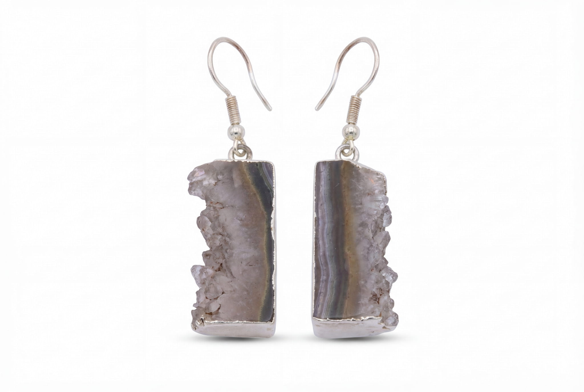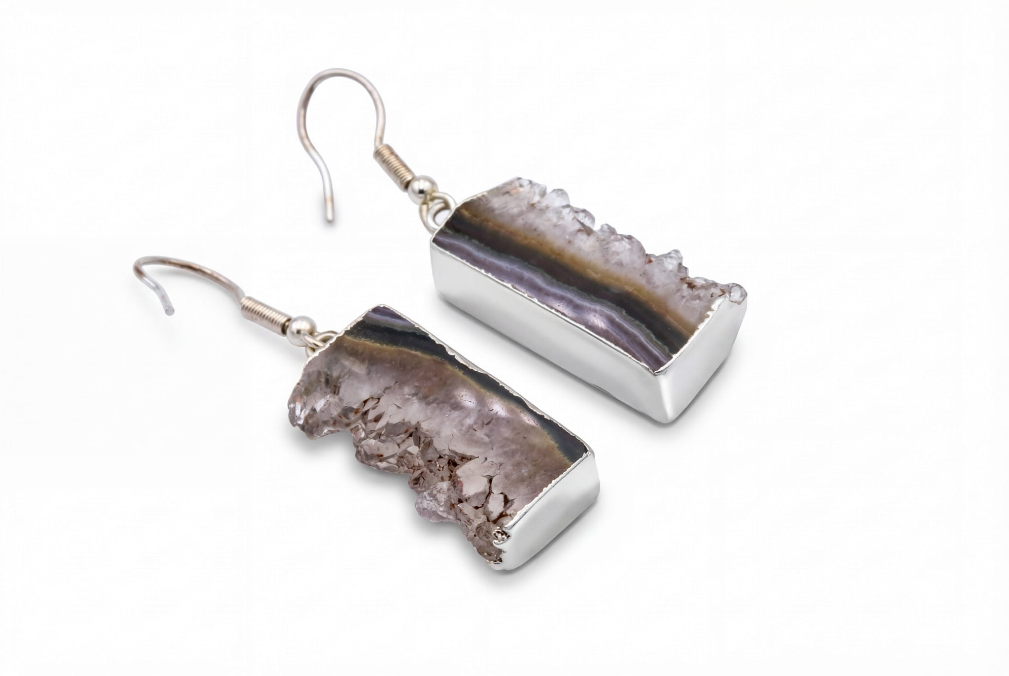 Każdy plaster ametystu to unikalny pejzaż zamknięty w krysztale. Z jednej strony gładka, wypolerowana powierzchnia ukazuje hipnotyzujące pasma i inkluzje – ciche świadectwo milionów lat formowania się głęboko pod ziemią. Z drugiej, surowa, nieokiełznana krawędź z drobnymi kryształkami lśni tysiącem refleksów. To biżuteria, która żyje. Przy każdym ruchu głowy ten niezwykły kamień ametyst ożywa, a światło tańczy na jego powierzchni, uwalniając subtelną energię prosto z serca Brazylii.