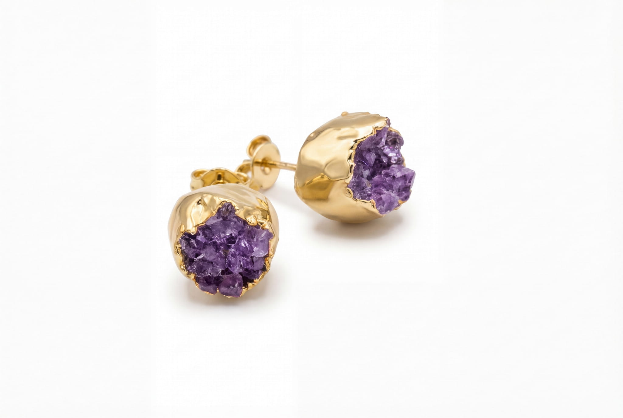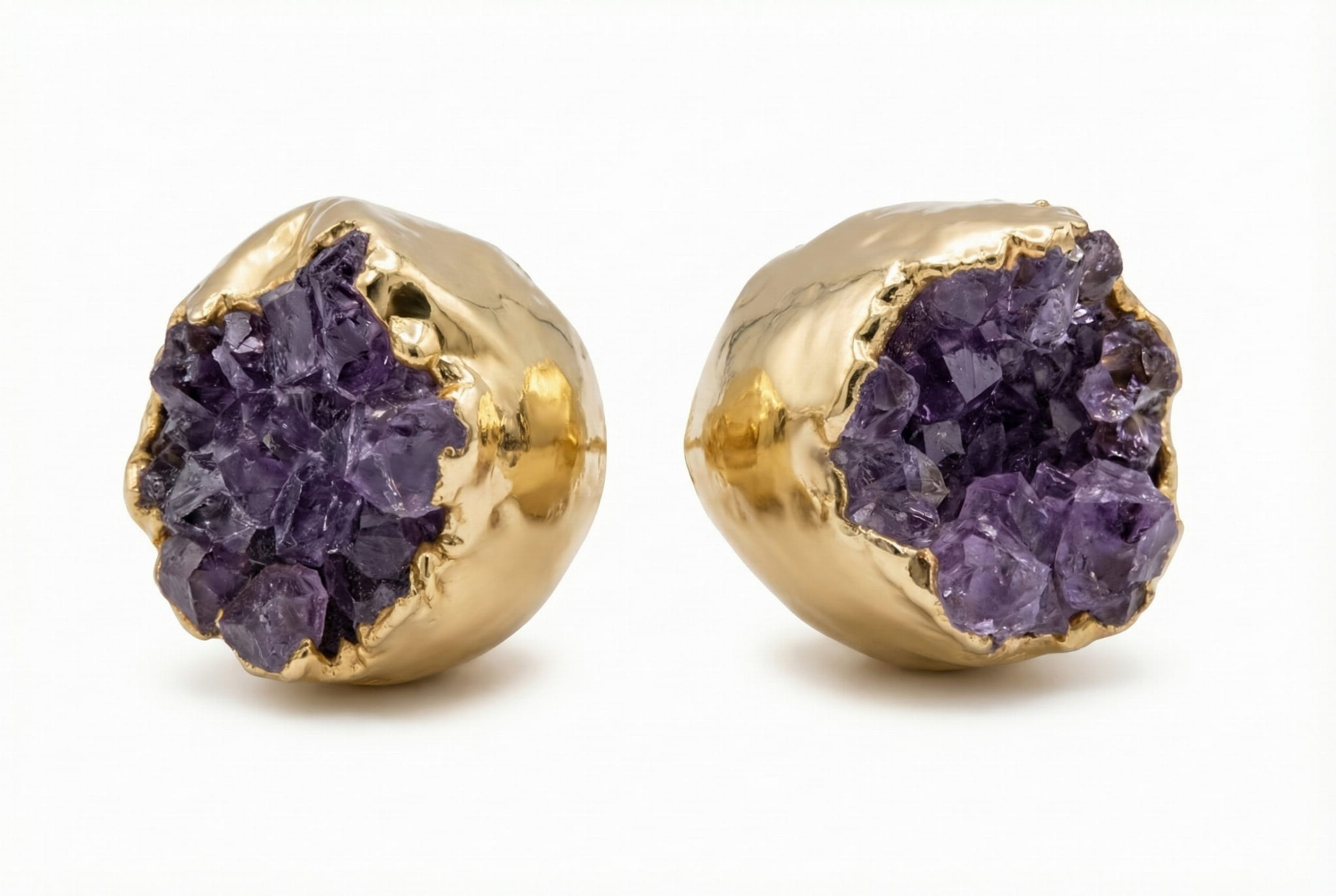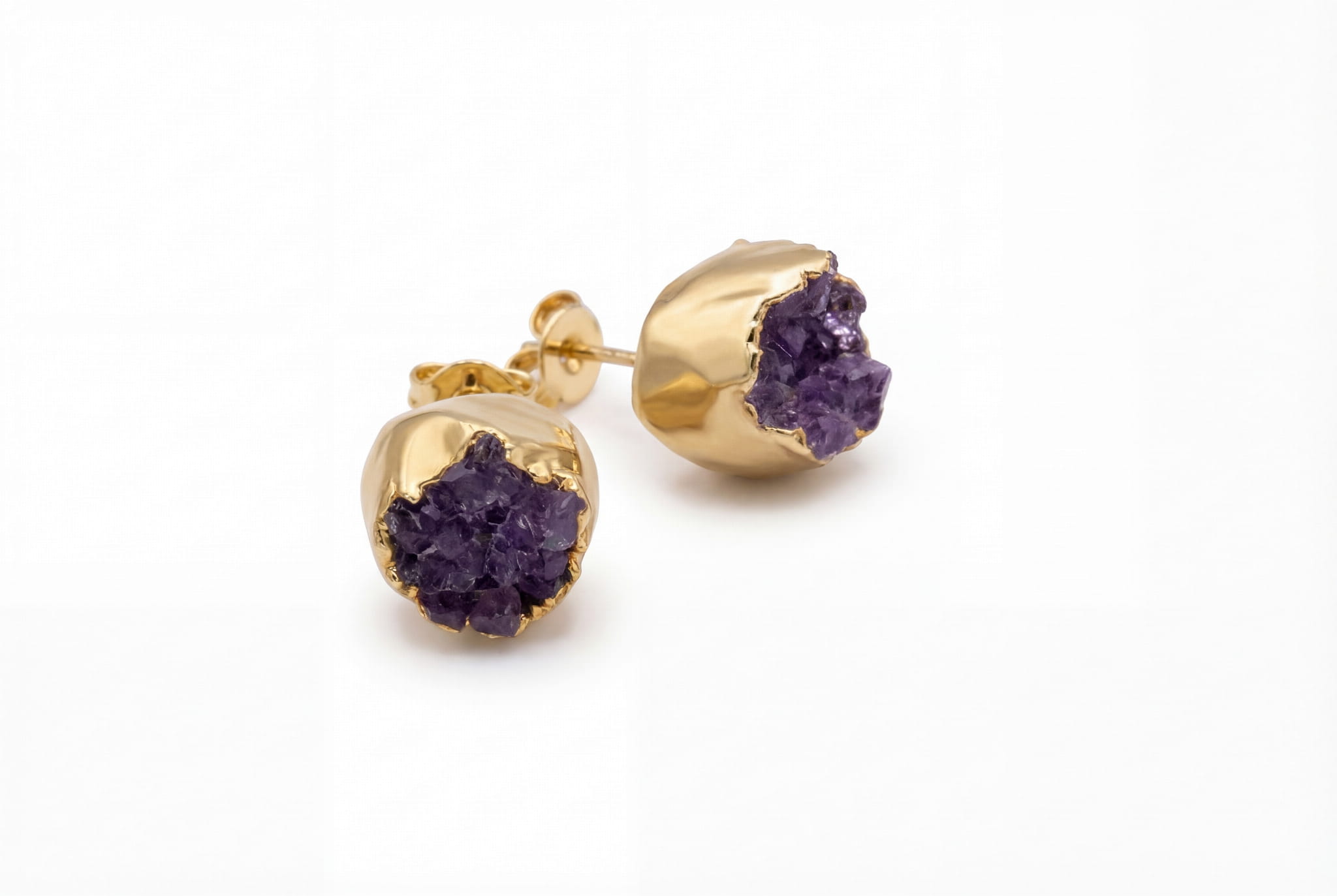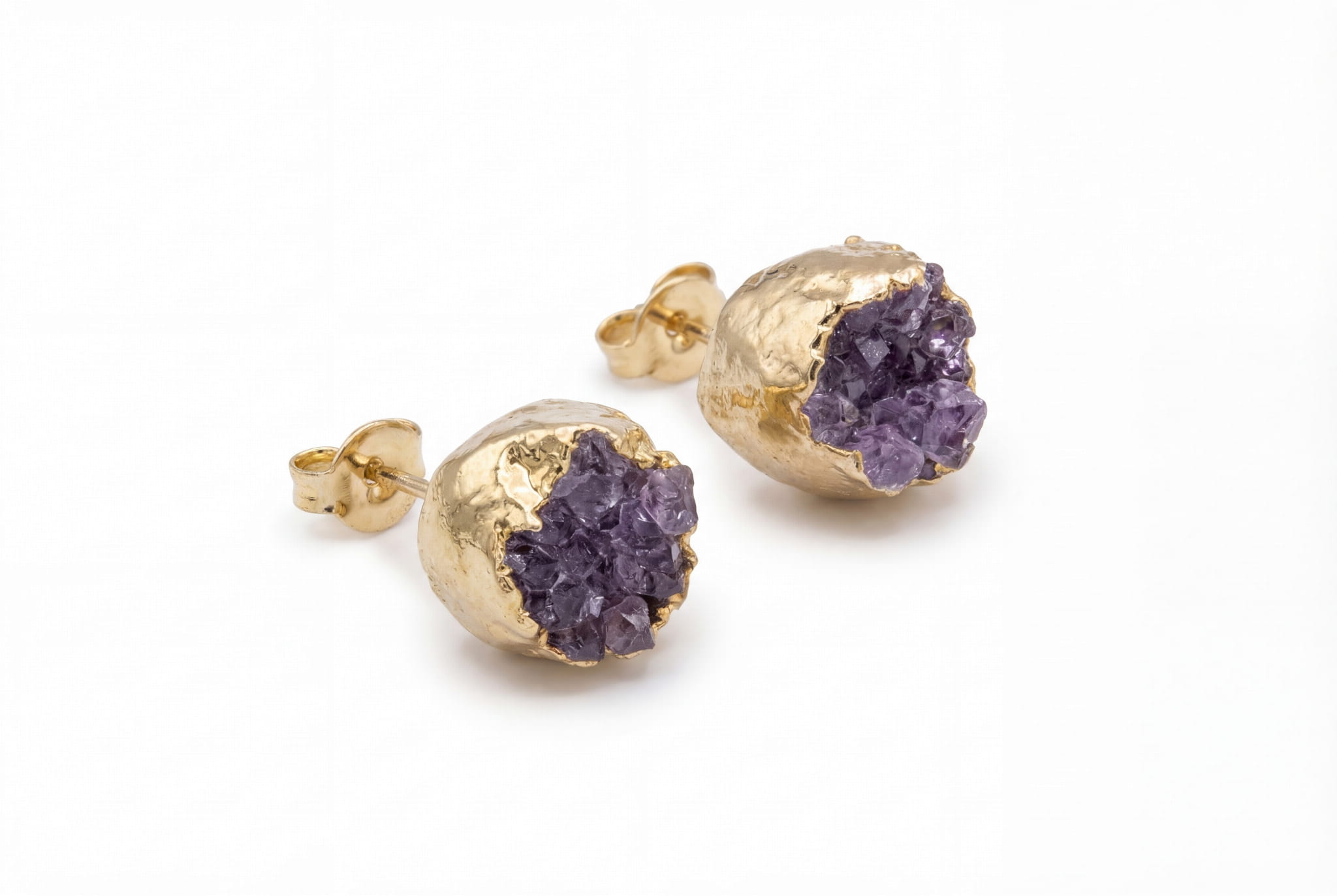 To nie jest zwykła biżuteria. To fragment natury, który spocznie tuż przy Twojej twarzy. W sercu każdego kolczyka drzemie surowa druza ametystu – mikroświat lśniących, fioletowych kryształów prosto z serca Brazylii. Zauważ, jak światło tańczy na ich powierzchni, wydobywając głębię barwy i naturalną strukturę. W naszej pracowni otuliliśmy ten surowy cud natury delikatną ramą 24-karatowego złota, tworząc harmonijny kontrast między tym, co dzikie, a tym, co szlachetne.