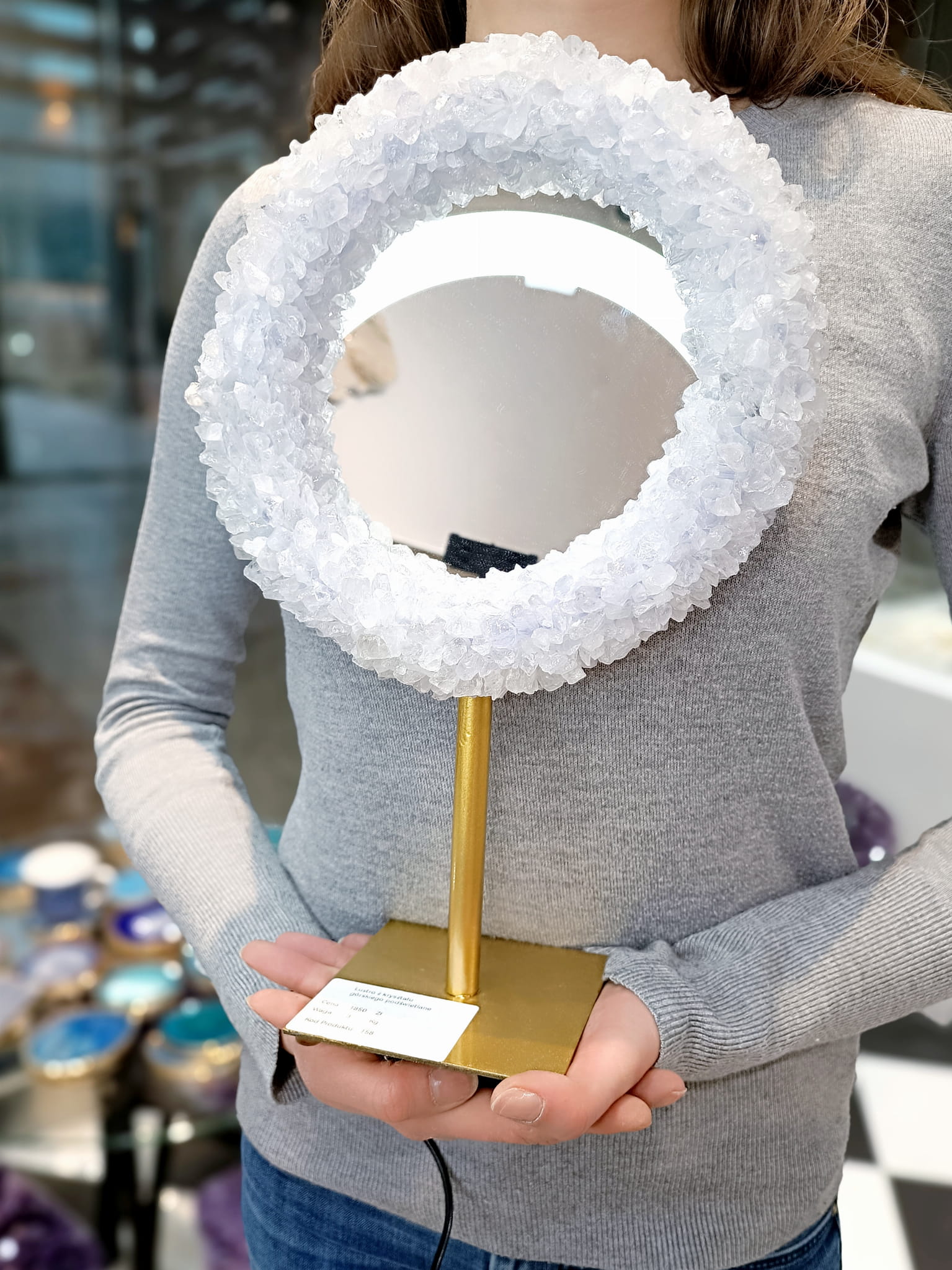 Odkryj magię naturalnego piękna z naszym wyjątkowym lustrem wykonanym z kryształu górskiego. Ten olśniewający dodatek, osadzony na eleganckiej złotej podstawie, wniesie do Twojego wnętrza powiew świeżości i harmonii, stając się centralnym punktem każdej aranżacji.