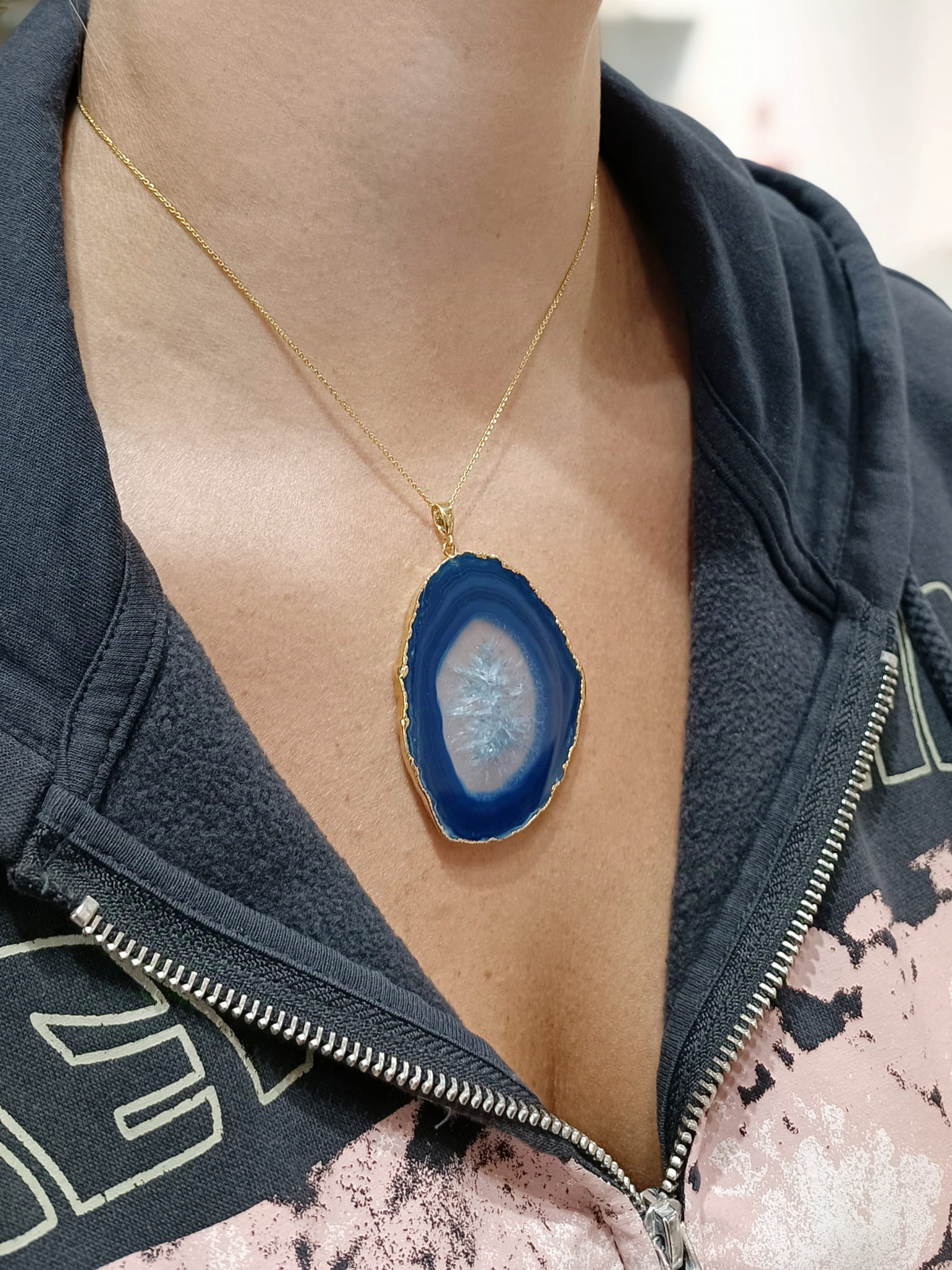 Odkryj magię naturalnego piękna z naszym ręcznie wykonanym naszyjnikiem z niebieskiego agatu, starannie pozłacanego 24-karatowym złotem. Ten wyjątkowy plaster agatu, pochodzący prosto z serca Brazylii, z regionu Rio Grande do Sul, znanego z najwspanialszych kamieni szlachetnych, emanuje głębią koloru i urzeka krystaliczną strukturą. Ciepły blask złota idealnie komponuje się z chłodnym odcieniem niebieskiego agatu, tworząc biżuterię, która doda blasku każdej stylizacji.