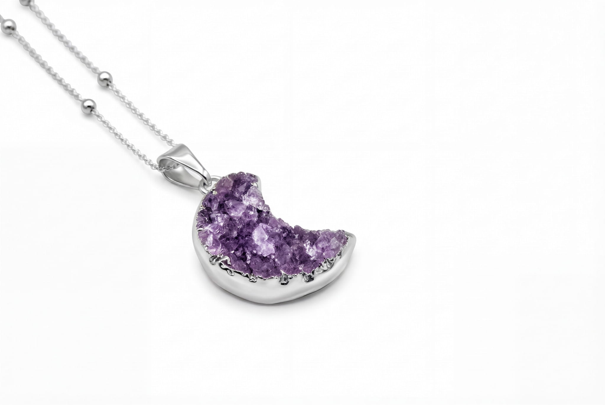 Odkryj magię naturalnej druzy ametystu w kształcie księżyca, ręcznie oprawionej w srebro. Naszyjnik o uniwersalnej długości to talizman pełen wewnętrznego spokoju.
