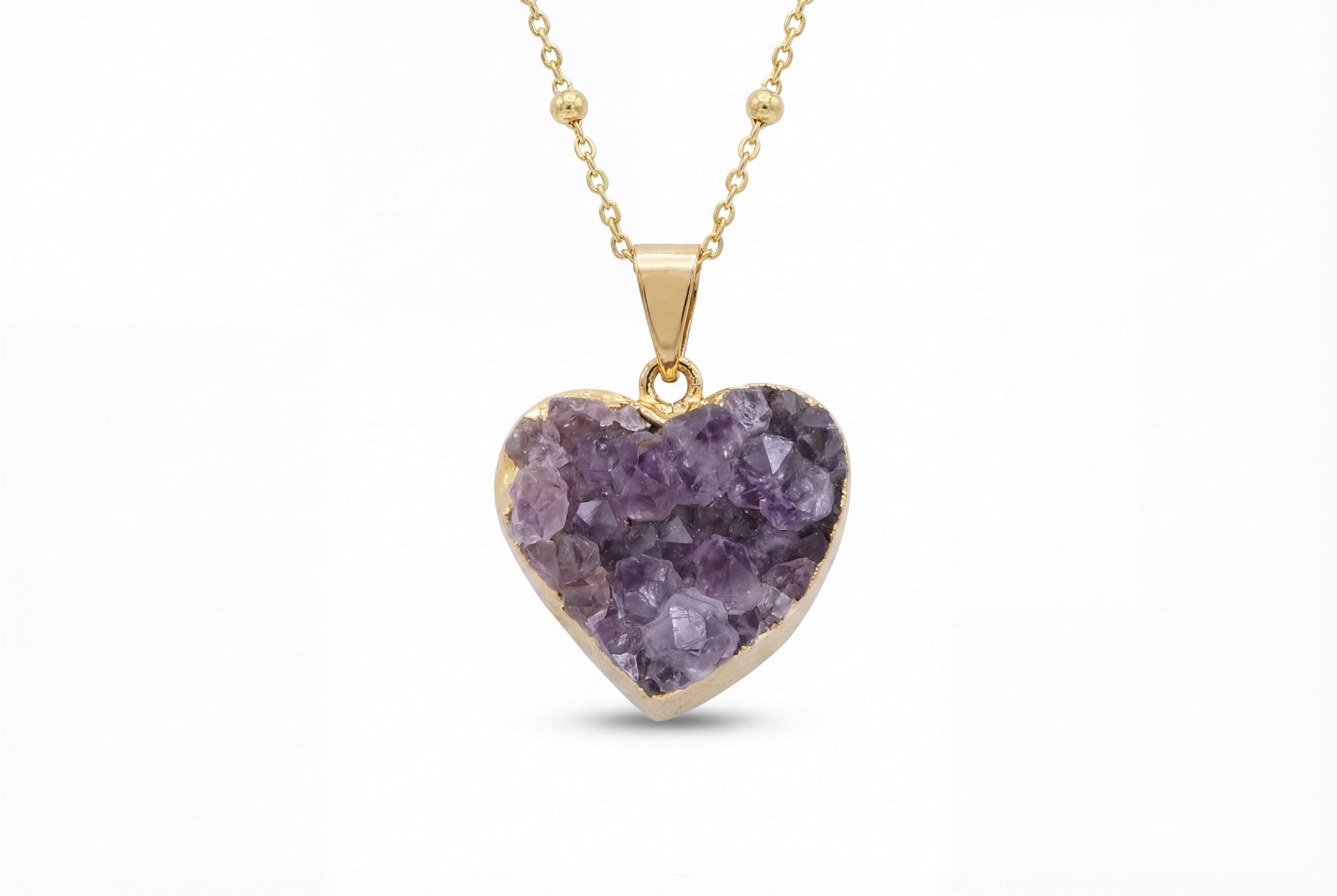Odkryj magię naturalnej druzy ametystu, ręcznie oprawionej w złocone serce. Ten wyjątkowy naszyjnik, dzięki regulowanej długości, idealnie dopasuje się do każdej stylizacji.