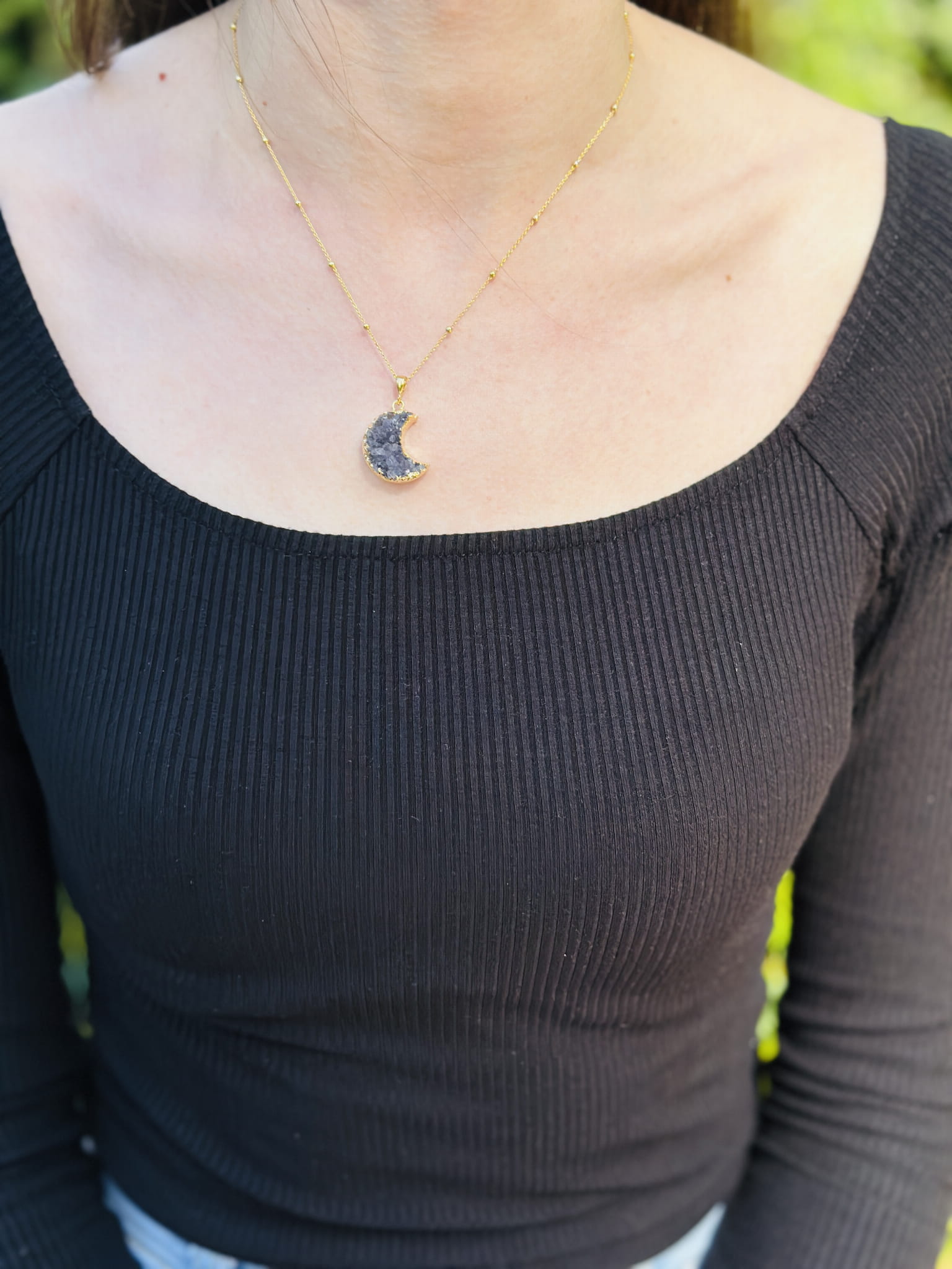 Przenieś się w świat magii i naturalnego piękna z wyjątkowym wisiorem w kształcie księżyca, wykonanym z ametystowej druzy, czyli naturalnych, mieniących się kryształów, które powstały w sercu ziemi. Każdy egzemplarz jest unikalny, a jego krawędzie zostały pokryte 24-karatowym złotem, co podkreśla szlachetny charakter minerału.