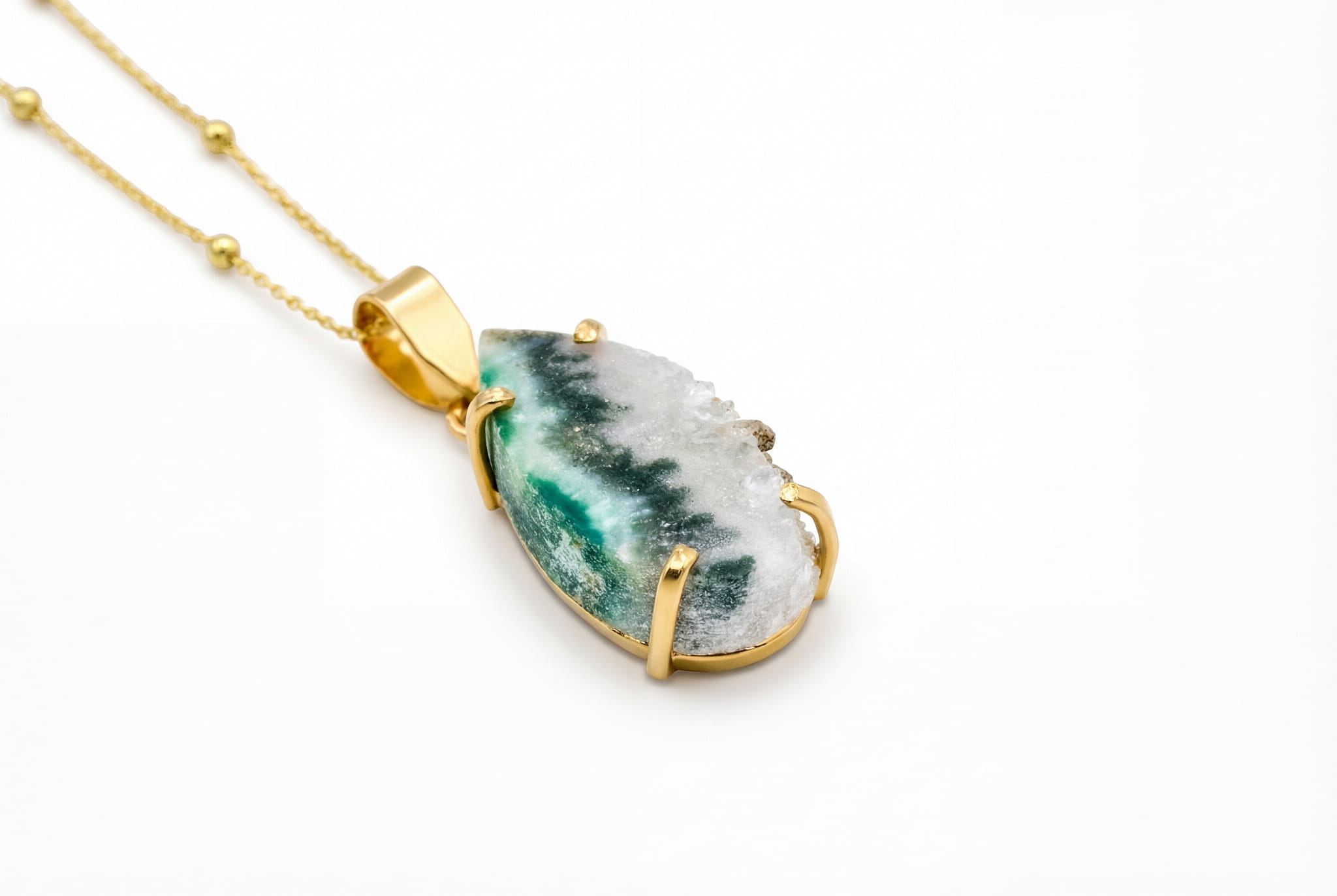 Odkryj niezwykły, zielono-szary plaster ametystu, ręcznie oprawiony przez nasze artystki w złocony koszyczek. Jego uniwersalna długość sprawia, że idealnie dopasuje się do każdej stylizacji, dodając jej unikalnego charakteru.