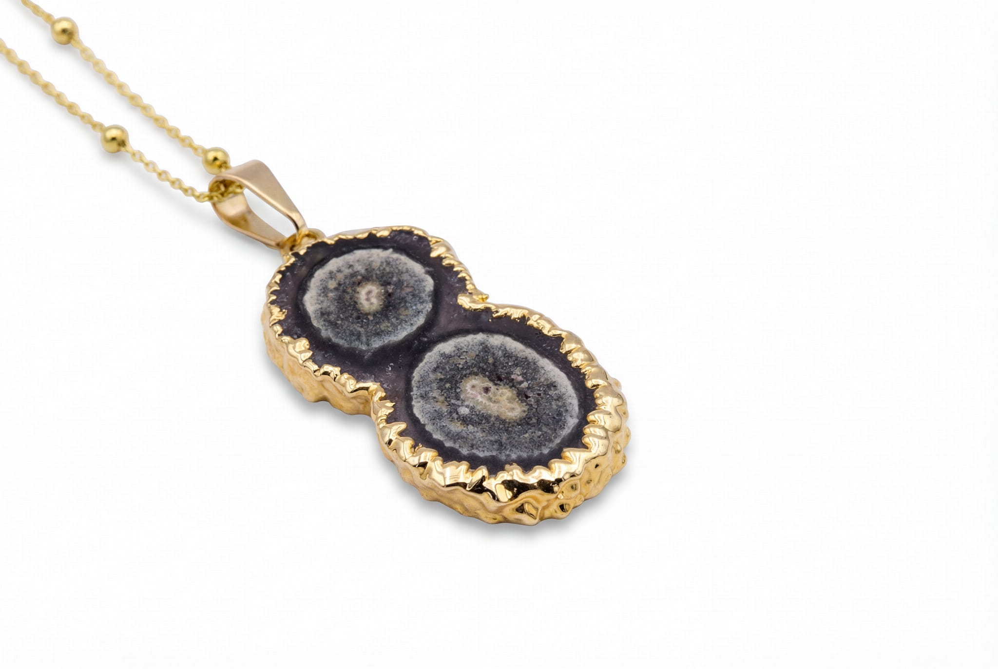 Unikatowy plaster ametystowego stalaktytu, którego naturalne brzegi ręcznie oprawiliśmy w 24-karatowe złoto. Dzięki regulowanej długości, naszyjnik idealnie dopasuje się do każdej stylizacji.