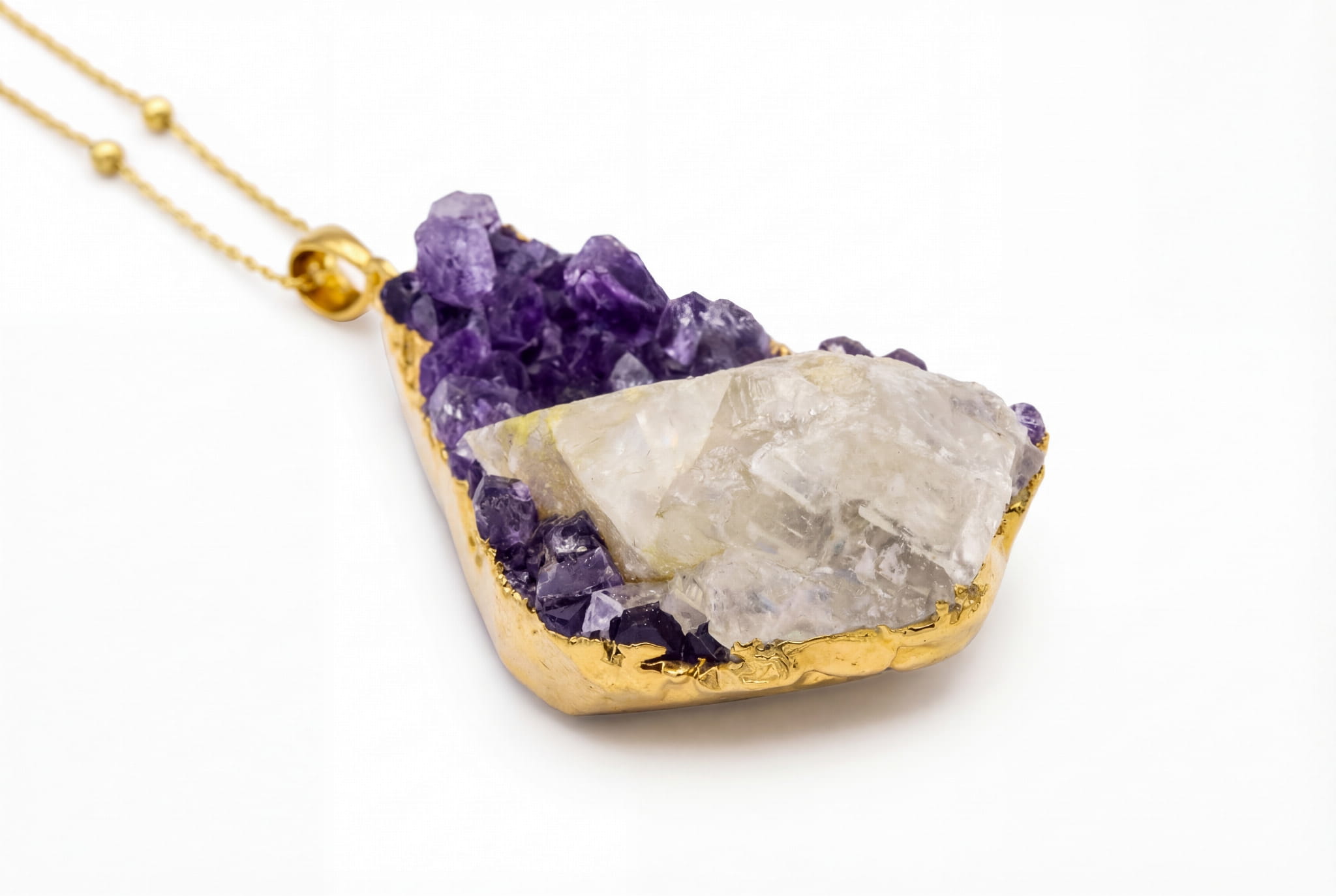 To nie jest zwykły wisiorek. To fragment natury, którego nie da się powtórzyć. Setki drobnych, fioletowych kryształów ametystu tworzą hipnotyzującą druzę, która mieni się przy każdym ruchu. Jego serce stanowi duży, mlecznobiały kryształ kalcytu, wrośnięty w strukturę ametystu – rzadkie i zjawiskowe połączenie stworzone przez ziemię na przestrzeni milionów lat.