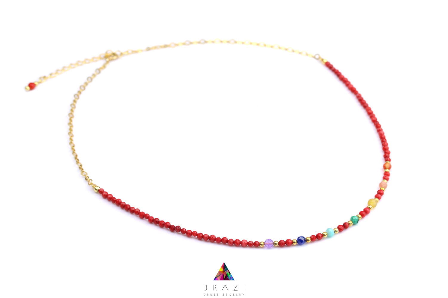 Delikatnie fasetowane koraliki czerwonego koralu, znanego ze swoich ochronnych właściwości, przeplatają się z energetyzującymi kamieniami czakr: karneolem, kamieniem słonecznym, cytrynem, malachitem, amazonitem, lapis lazuli i ametystem. Każdy z nich odpowiada za inną sferę Twojego życia, wspierając równowagę i witalność. Czerwony koral, tradycyjnie kojarzony z odwagą i witalnością, dodaje naszyjnikowi subtelnego blasku i wzmacnia działanie pozostałych kamieni.