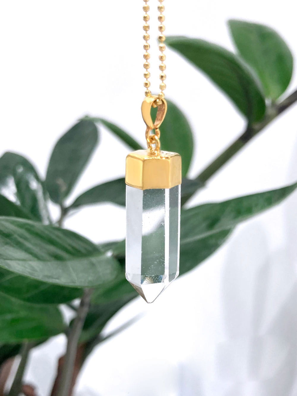 to ponadczasowa naturalna biżuteria wykonana z kamienia jakim jest kryształ górski. Oszlifowany w kształt obelisku, który podkreśla jego transparentność. Pozłocenie na topie kamienia dodaje mu elegancji i pięknie kontrastuje. To naszyjnik, który będzie Twoim ulubionym dodatkiem każdego dnia ale również sprawdzi się do bardziej eleganckich stylizacji.