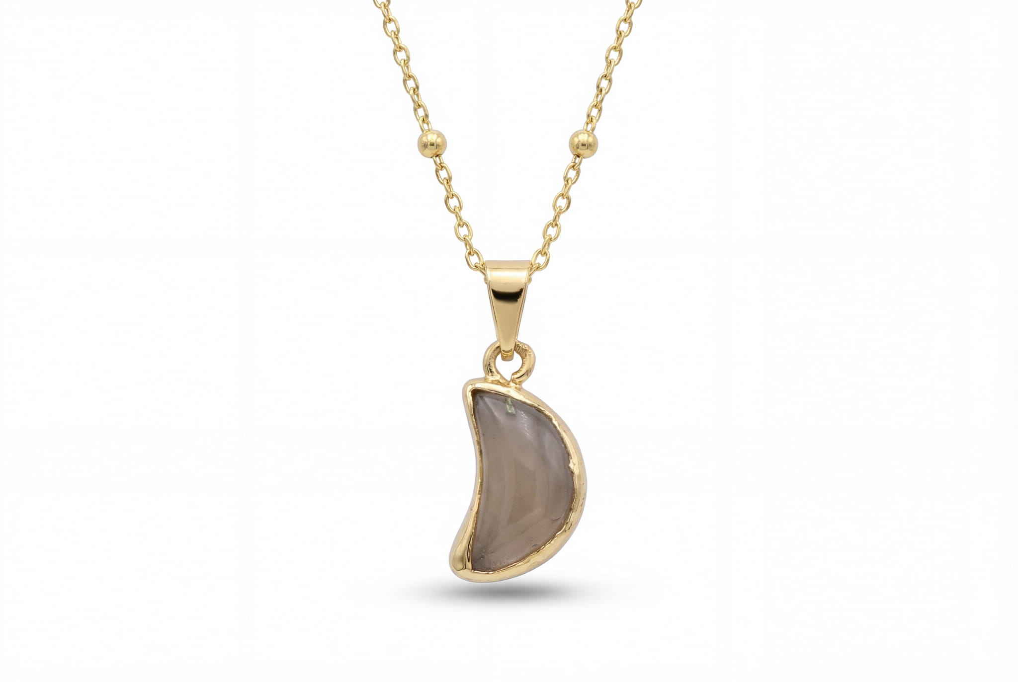Odkryj subtelną moc kwarcu dymnego w formie ręcznie szlifowanego księżyca. Każdy naszyjnik, oprawiony w pozłacane srebro, to unikatowy talizman wykonany w naszej pracowni.