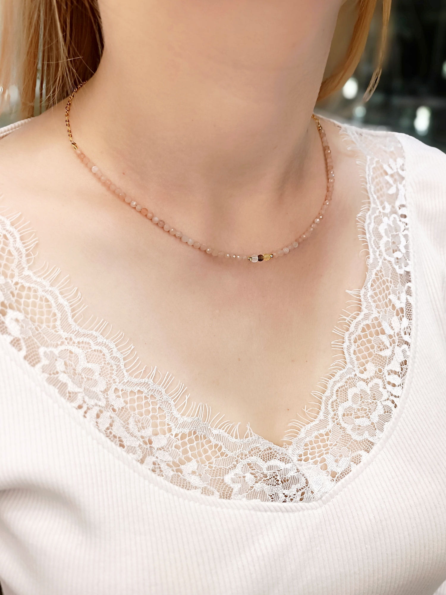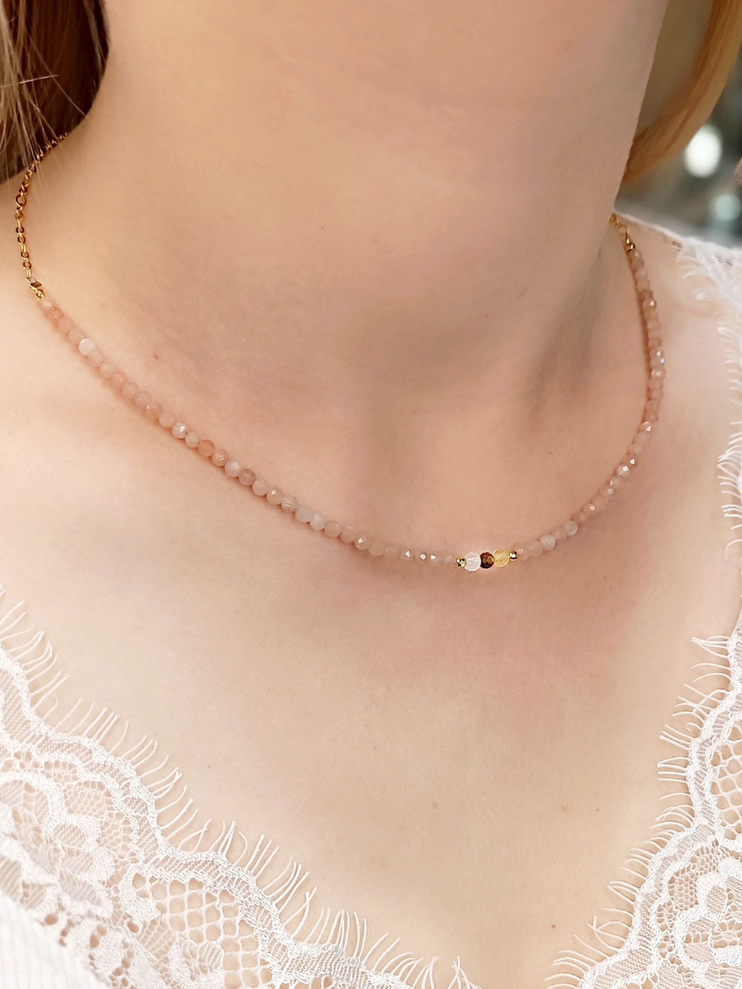 Wszystkie nasze naszyjniki tworzymy ręcznie w pracowni. Do nawlekania kamieni używamy profesjonalnej linki jubilerskiej – jest to bardzo mocny, stalowy splot zapewniający bezpieczeństwo użytkowania, który zarazem pozwala naszyjnikowi miękko układać się na ciele.