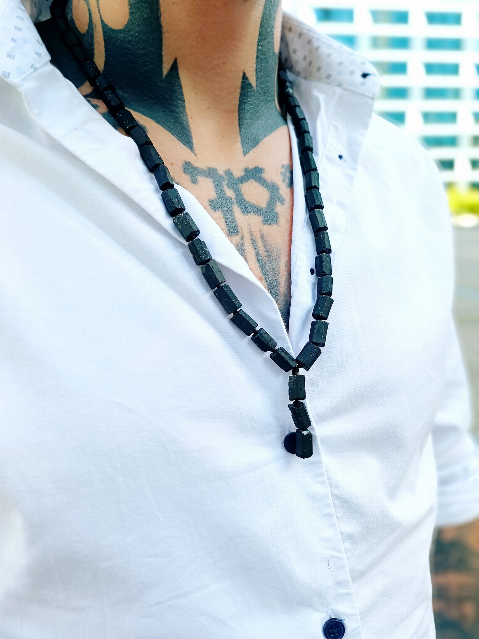Odkryj surową elegancję i energetyzującą moc natury z naszym męskim naszyjnikiem z matowego turmalinu. Ten wyjątkowy dodatek, wykonany ręcznie w naszej warszawskiej pracowni na ulicy Grzybowskiej 61, to połączenie minimalistycznego designu z ochronnymi właściwościami turmalinu, kamienia od wieków cenionego za swoje energetyczne działanie.
