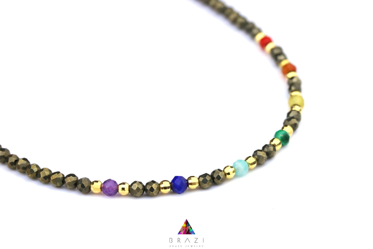 Naszyjnik składa się z dwóch części: starannie fasetowanych koralików pirytu i kamieni czakr oraz ozdobnego łańcuszka wykonanego ze srebra lub srebra pozłacanego 24-karatowym złotem. Dodatkowe srebrne lub pozłacane kulki rozświetlają całość, dodając naszyjnikowi subtelnego blasku. Dzięki delikatnemu rozmiarowi kamieni (ok. 3 mm) i optymalnej długości (40 cm + 4 cm przedłużki) naszyjnik doskonale dopasowuje się do każdej stylizacji, stanowiąc idealny dodatek zarówno na co dzień, jak i na specjalne okazje. Odkryj w sobie harmonię z biżuterią Brazi.pl.