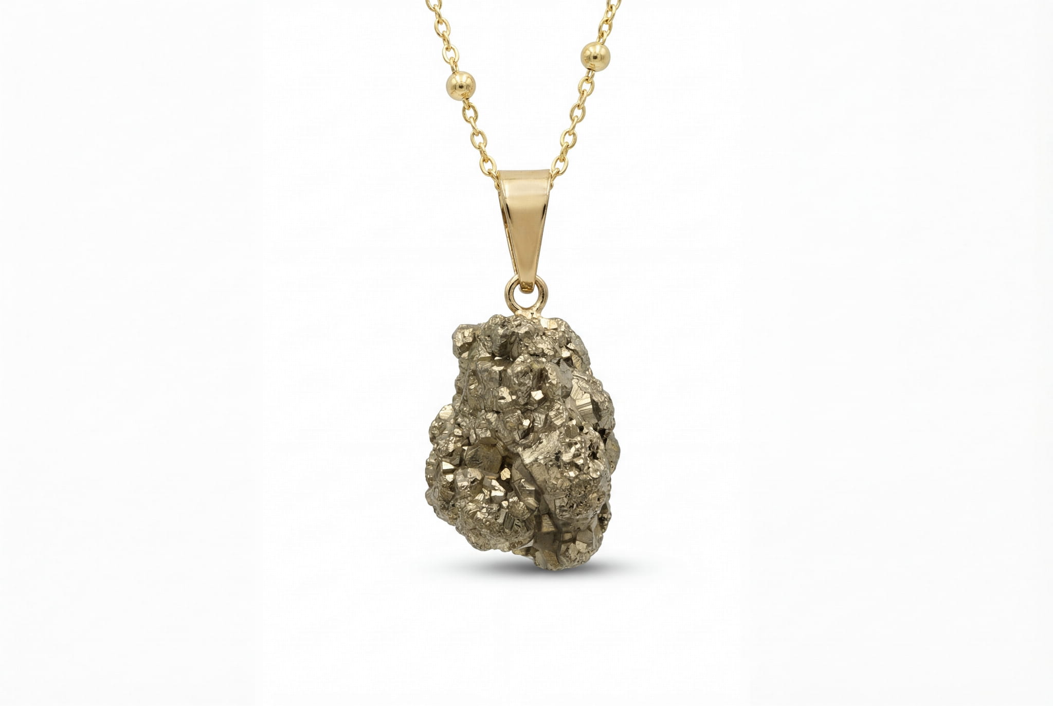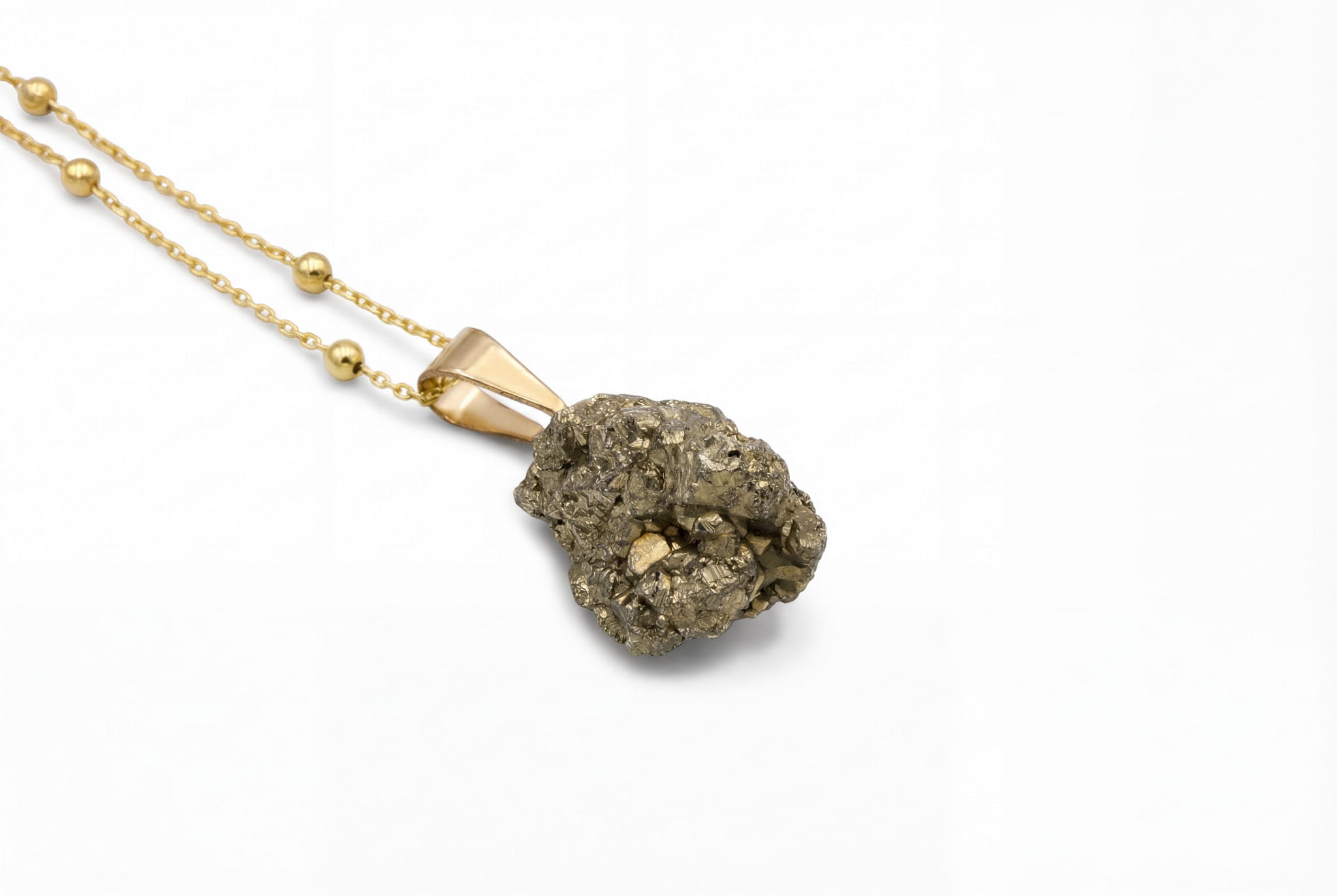 Odkryj surowe piękno naturalnej bryłki pirytu, ręcznie oprawionej w pozłacane srebro. Nasz naszyjnik, dzięki uniwersalnej długości, staje się idealnym talizmanem blasku na każdą okazję.