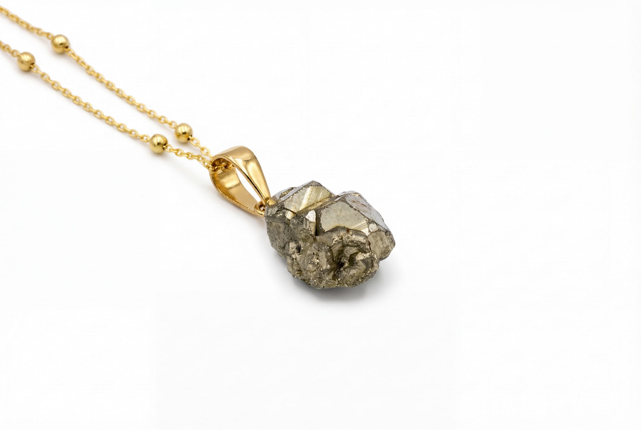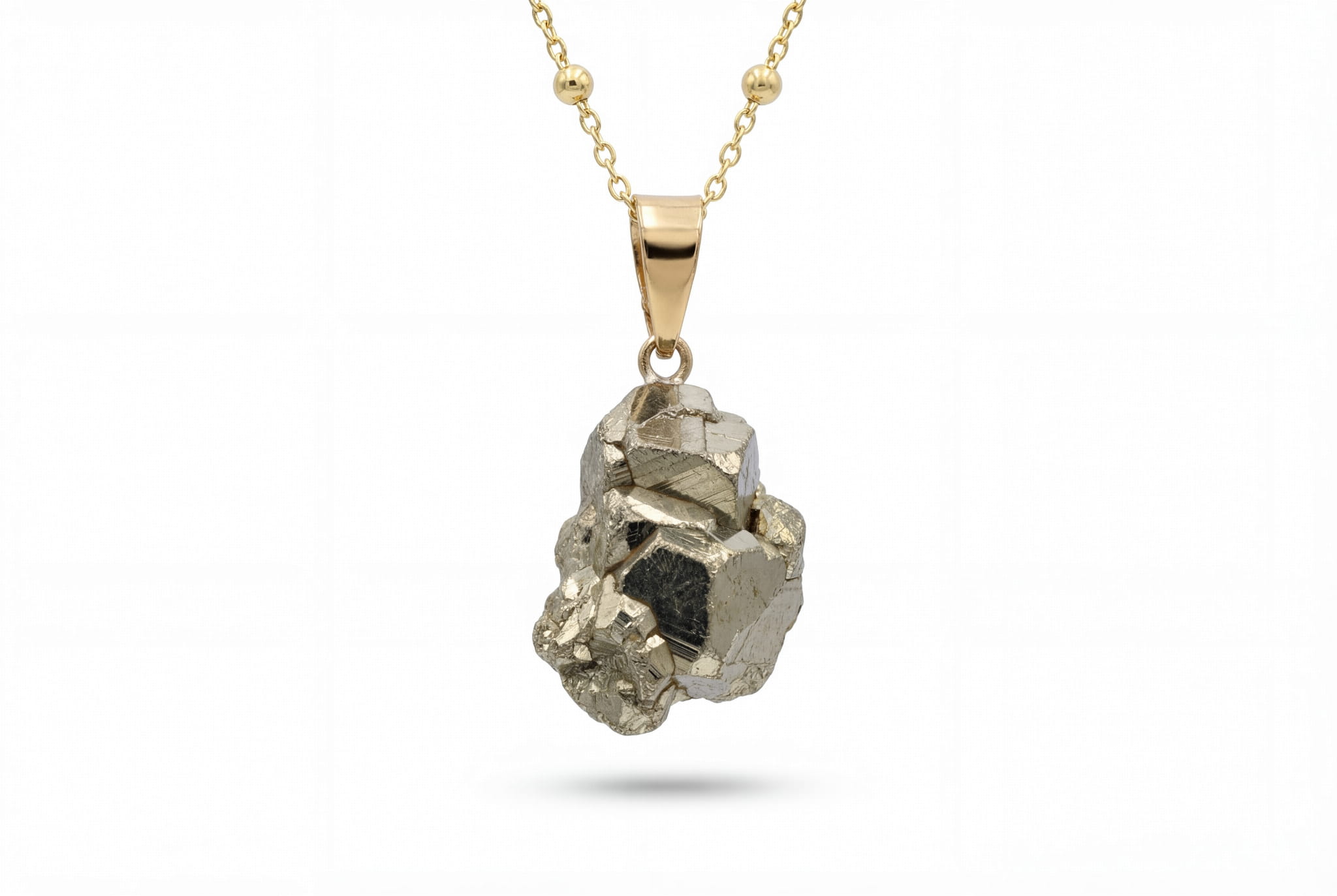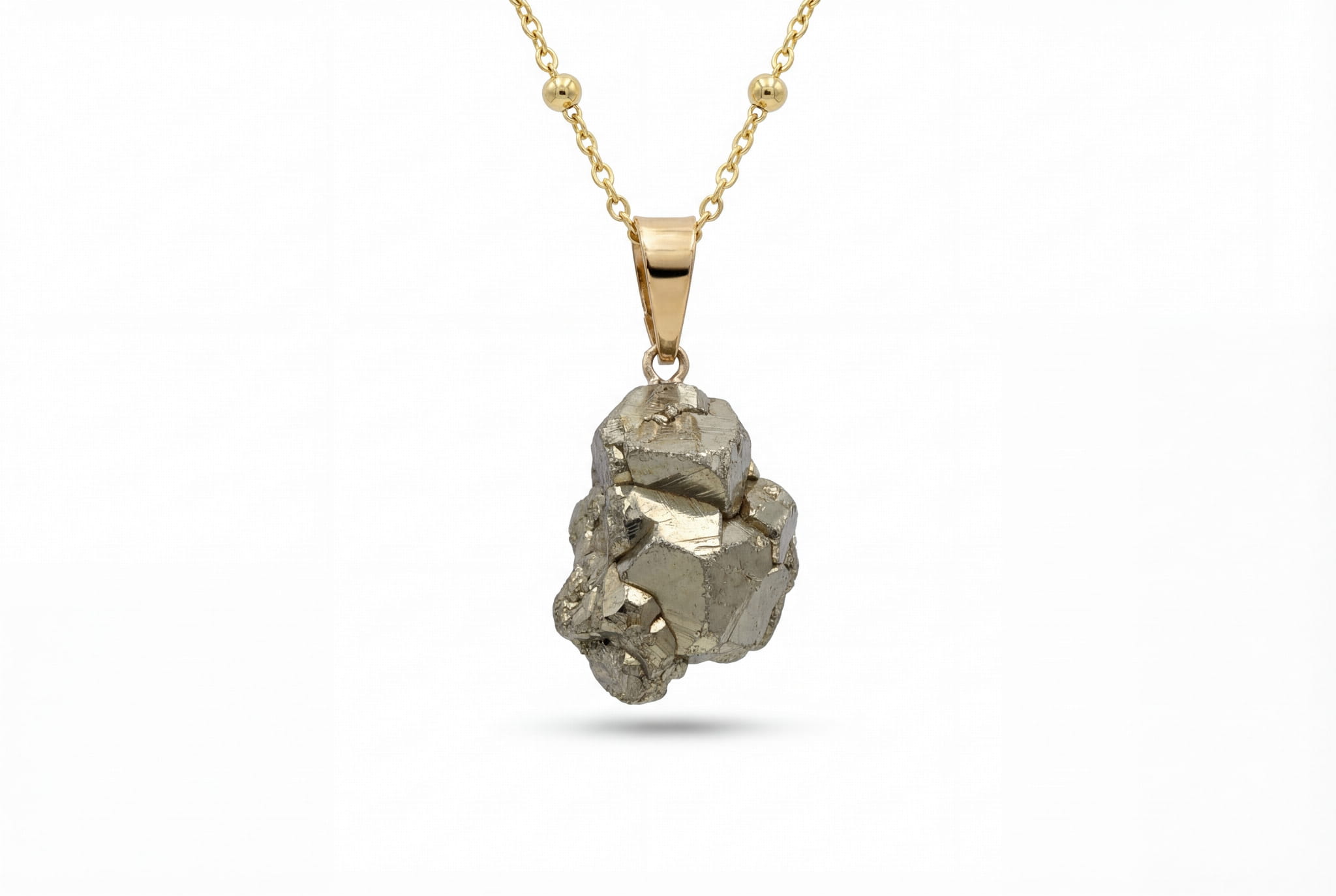 Ten naszyjnik to hołd dla pierwotnej siły ziemi. W jego sercu drzemie surowa, nieoszlifowana bryłka pirytu, której każda ścianka opowiada historię swojego powstania. Sprowadzony prosto z Peru, kamień zachwyca metalicznym, złotym blaskiem i naturalną strukturą krystaliczną. Nasze artystki starannie wybrały ten unikatowy okaz, by jego niepowtarzalny charakter mógł w pełni zabłysnąć.
