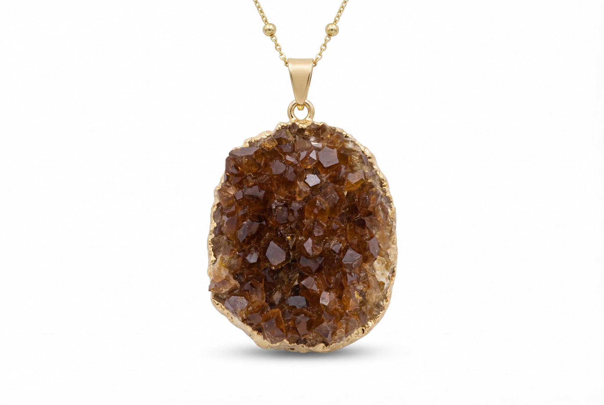 Ten naszyjnik to celebracja surowego piękna natury. W jego sercu drzemie naturalna szczotka cytrynowych kryształów, starannie wybrana przez nasze artystki prosto z Brazylii. Każdy egzemplarz jest niepowtarzalny – jego kształt, wielkość i układ drobnych kryształków to dzieło ziemi, a nie maszyny. Zauważ, jak światło gra na niezliczonych fasetach, wydobywając ciepłe, miodowe i brązowe tony kamienia, które podkreśliliśmy, oblewając jego brzegi płynnym, 24-karatowym złotem.