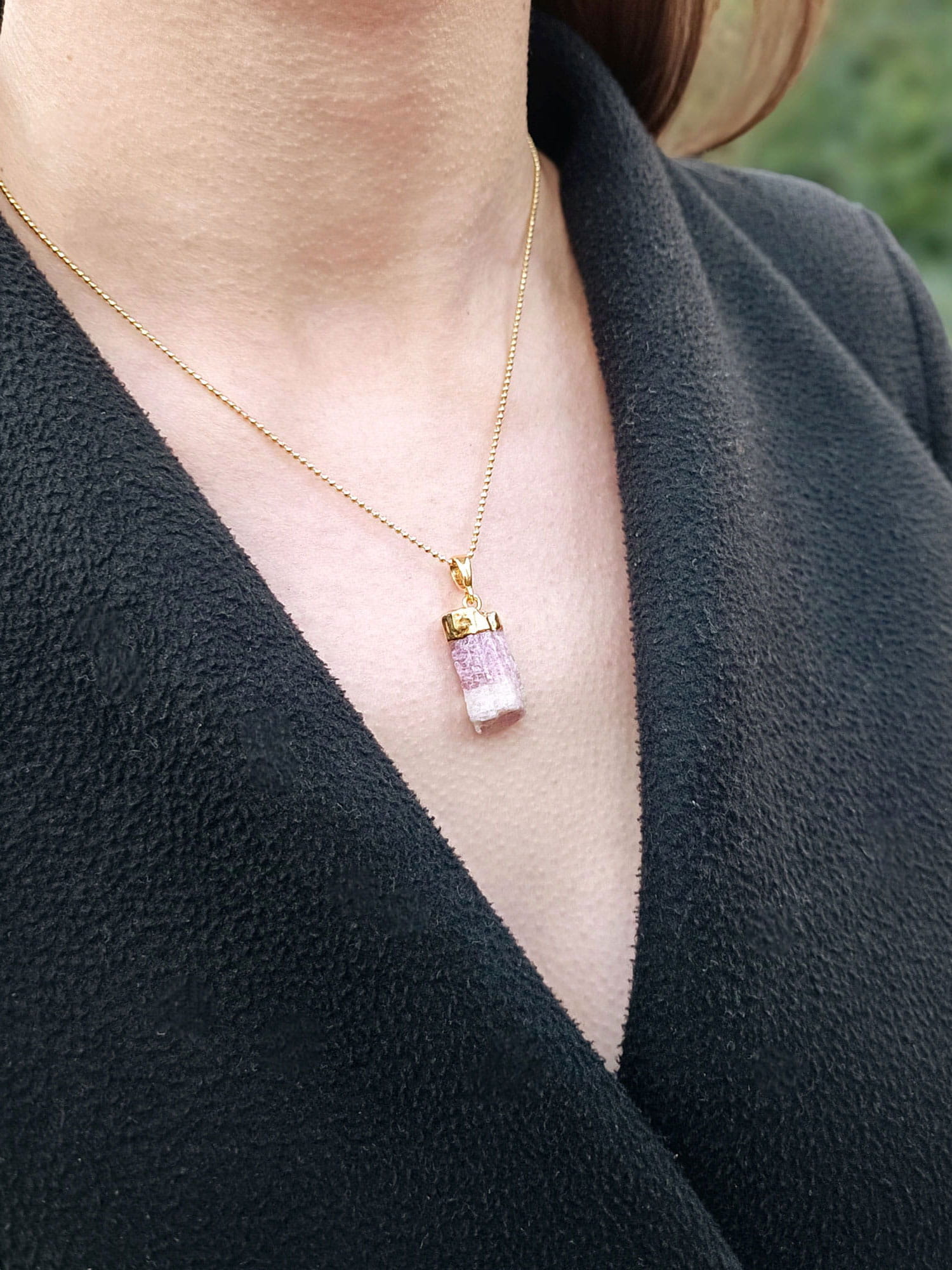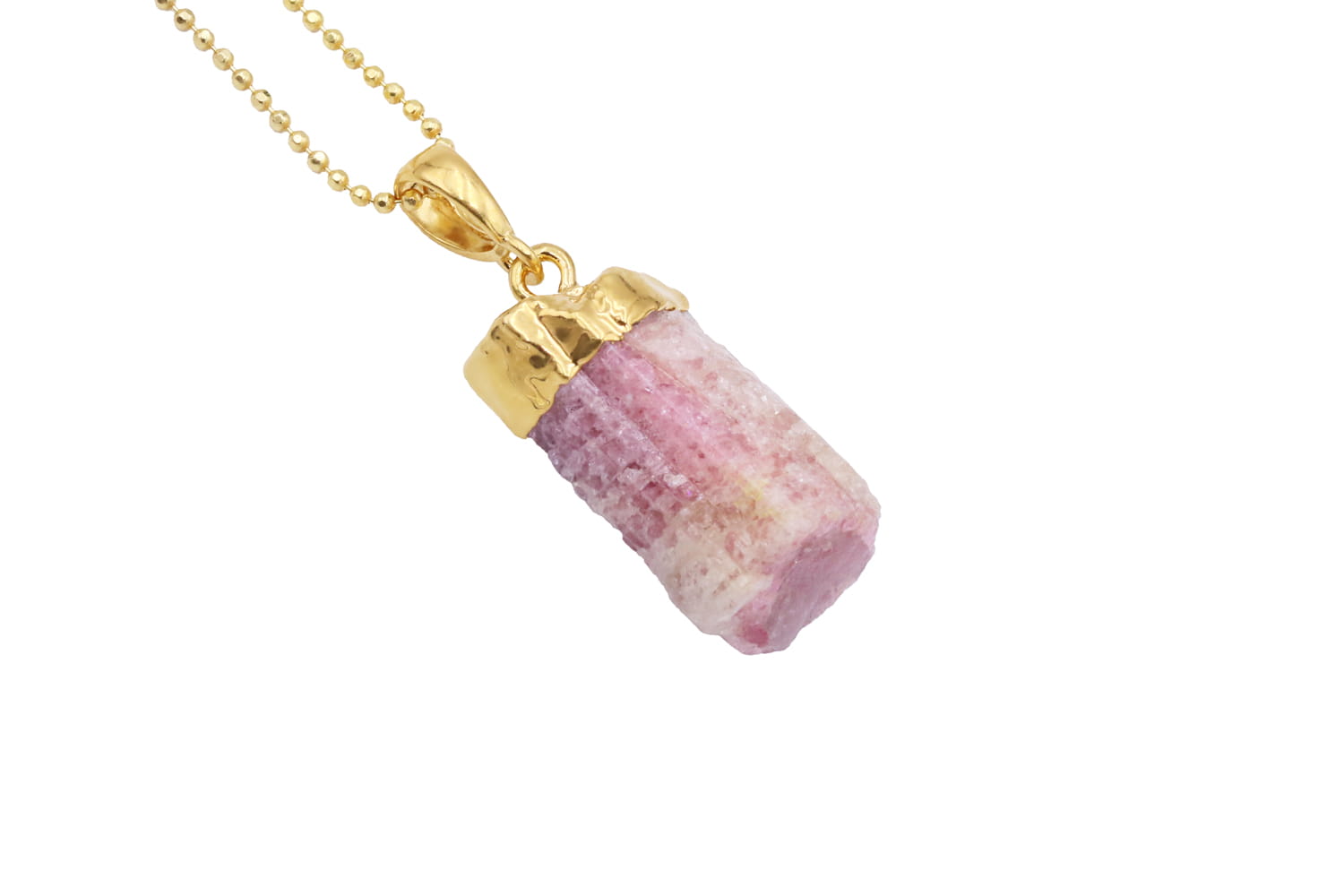 Odkryj subtelną elegancję naszyjnika z surowym turmalinem różowym, otulonego delikatnym blaskiem 24-karatowego złota. Ten wyjątkowy dodatek, wykonany z naturalnego kamienia, emanuje delikatnym różowym blaskiem, który podkreśli Twoją kobiecość i doda blasku każdej stylizacji. Idealny dla kobiet ceniących naturalne piękno i ręcznie robioną biżuterię, ten naszyjnik to połączenie prostoty i wyrafinowania.