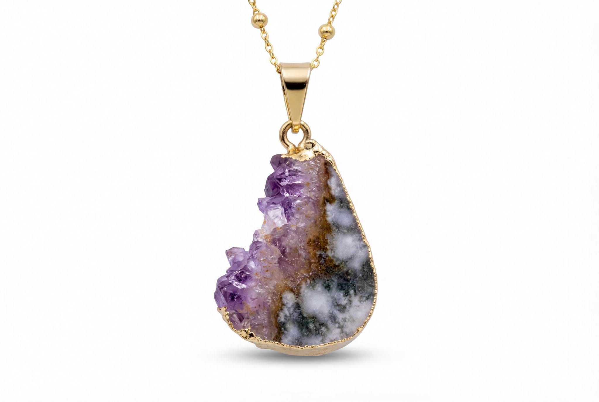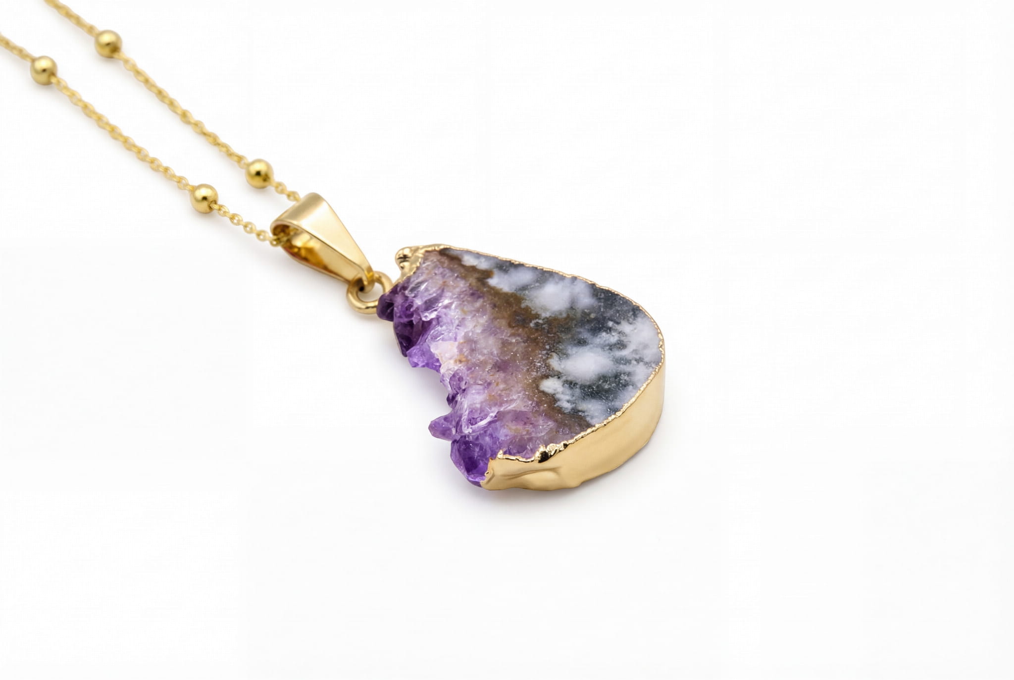 Odkryj unikalny plaster ametystu, ręcznie oprawiony w złocone srebro, którego surowe kryształy opowiadają historię natury. Naszyjnik w zestawie z łańcuszkiem o uniwersalnej długości dopasuje się do Ciebie.