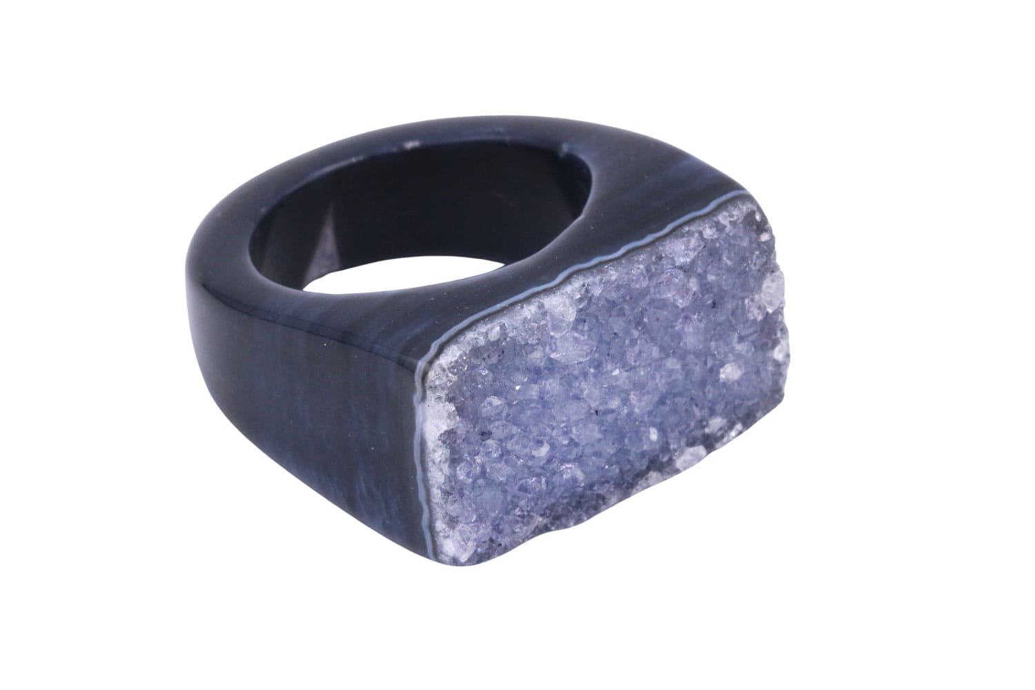 Elegancki pierścionek wykonany z jednego kawałka czarnego agatu druzy, pochodzącego z Brazylii. Idealny wybór dla kobiet ceniących naturalne piękno i unikalny design.