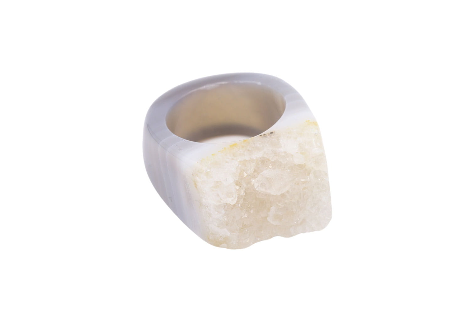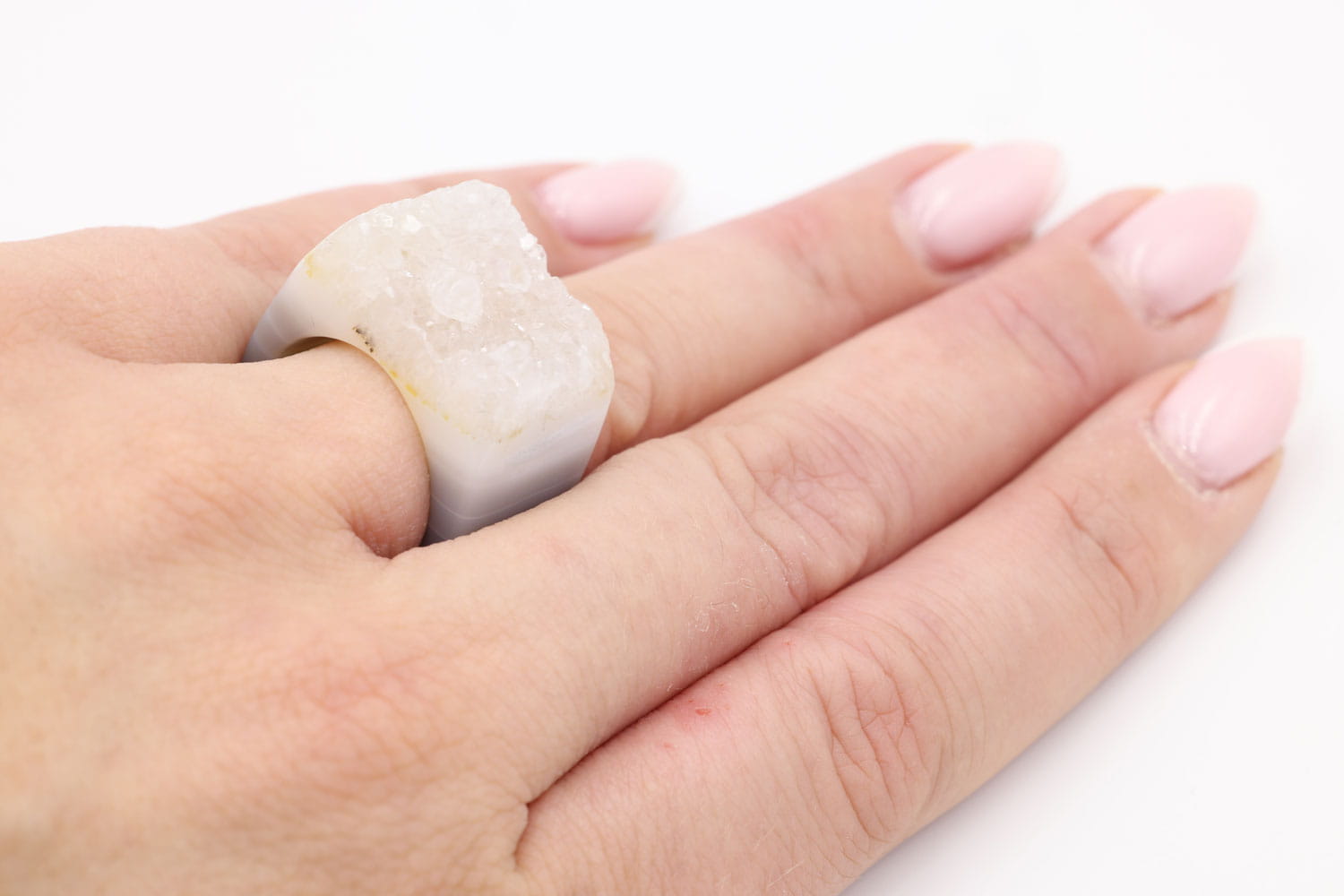 Odkryj piękno natury z naszym wyjątkowym pierścionkiem wykonanym z jednego kawałka szarego agatu druzy. Idealny dla kobiet ceniących sobie unikalność i naturalne piękno.