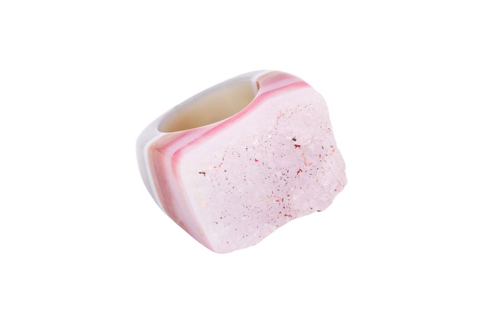Wyjątkowy pierścionek z agatu druza w kolorze różowym, ręcznie wyrzeźbiony z jednego kawałka minerału. Idealny dla kobiet ceniących naturalne piękno i unikatowy design.