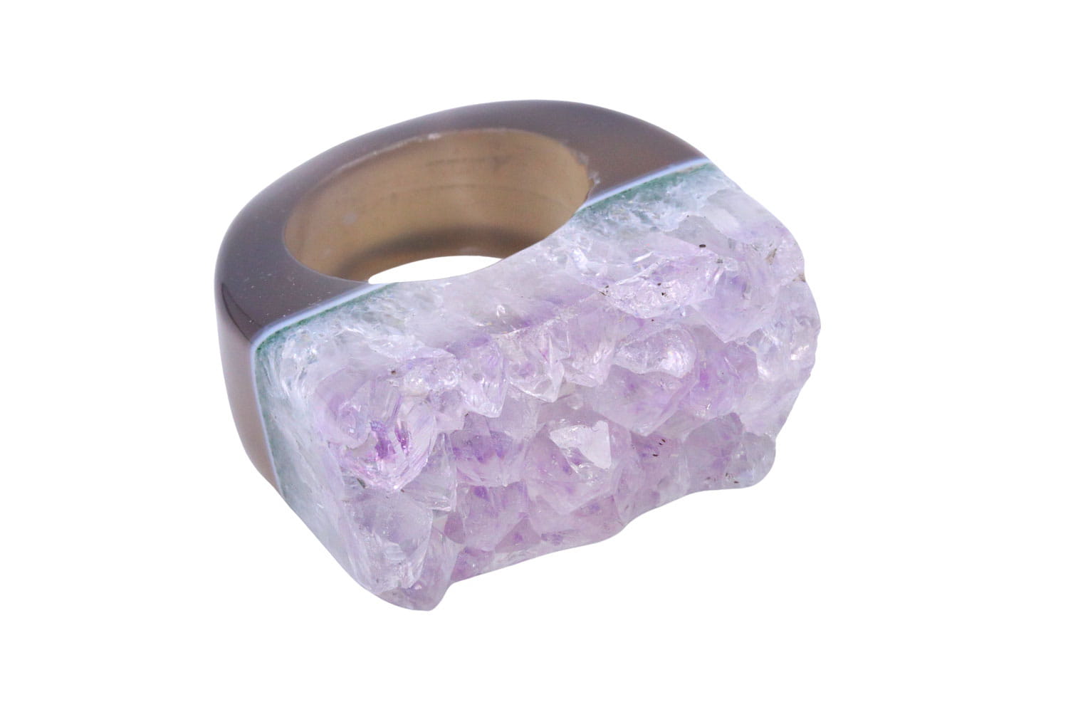 Elegancki pierścionek z ametystu o unikalnej strukturze druzy, idealny dla kobiet ceniących naturalne piękno i wyrafinowany styl.