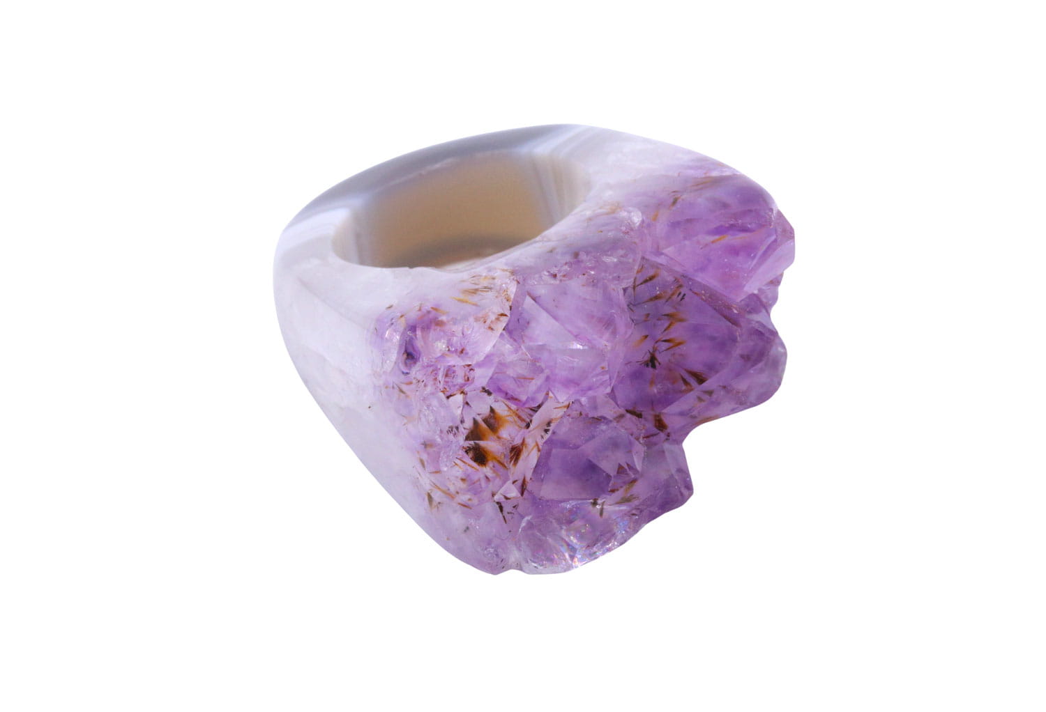 Elegancki pierścionek wykonany z naturalnego ametystu druzy, doskonały dla kobiet ceniących wyjątkową biżuterię. Pochodzący z Brazylii minerał zachwyca intensywnym fioletowym odcieniem.