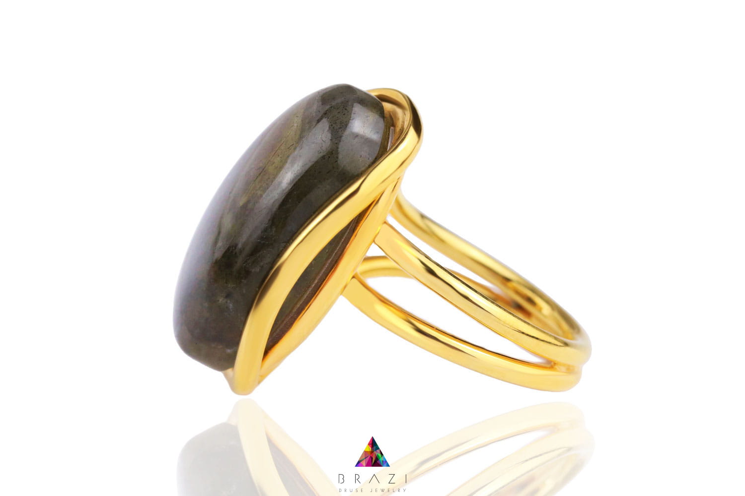 Zanurz się w głębi koloru i blasku z naszym eleganckim, złoconym pierścionkiem z owalnym labradorytem. Ten niezwykły kamień, mieniący się odcieniami szarości z intensywną, niebieską iryzacją, doda Twojej stylizacji nutki tajemniczości i wyrafinowania. Regulowana obrączka wykonana ze srebra pozłacanego 24-karatowym złotem, zapewnia idealne dopasowanie i komfort noszenia. Ten pierścionek to doskonały wybór dla kobiet ceniących sobie niebanalną biżuterię ręcznie robioną.