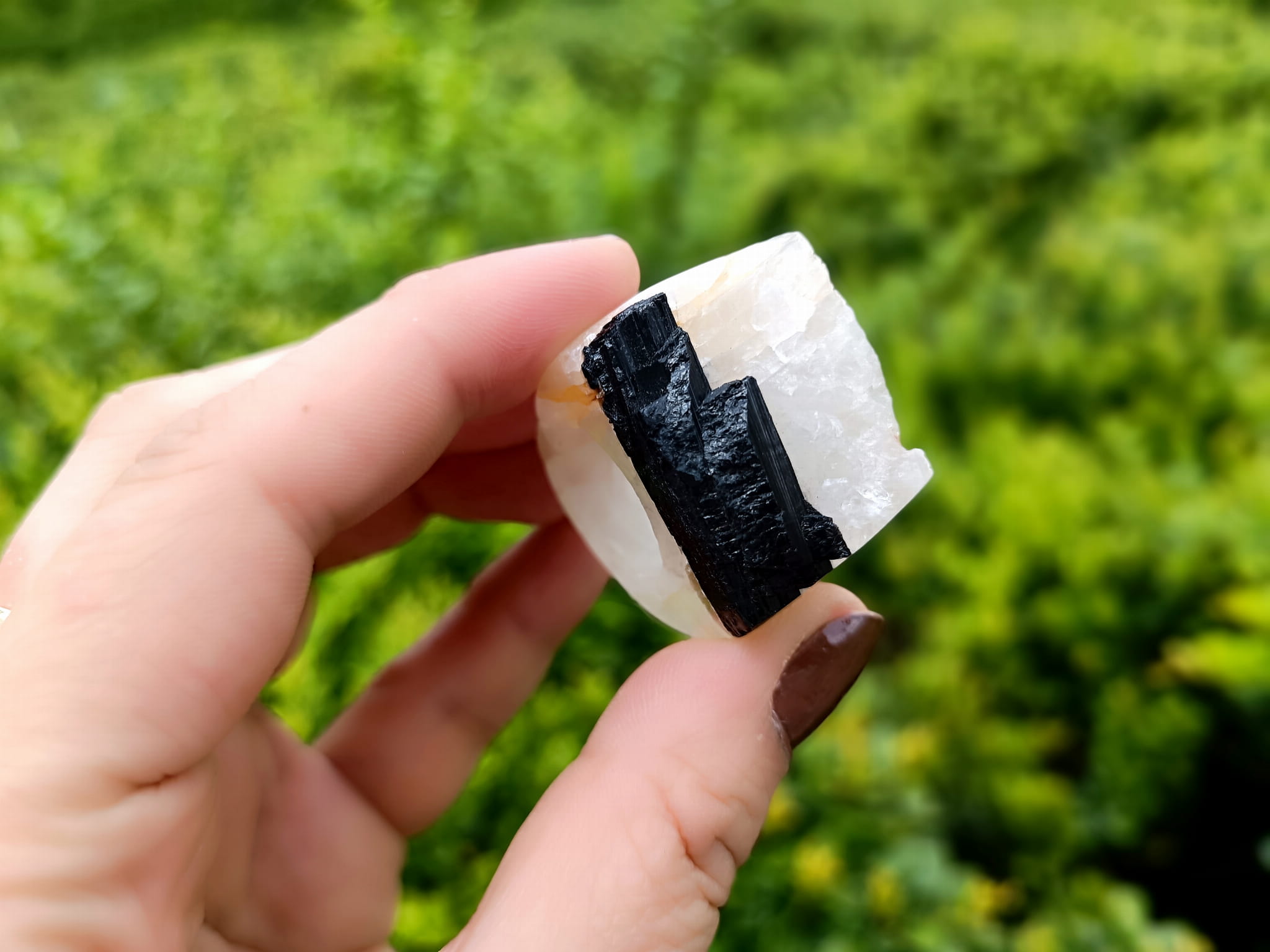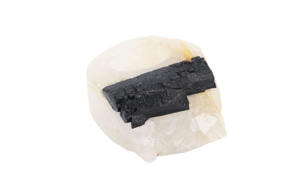 - Unikalna konstrukcja z jednego kawałka białego kwarcu z czarnym turmalinem na topie