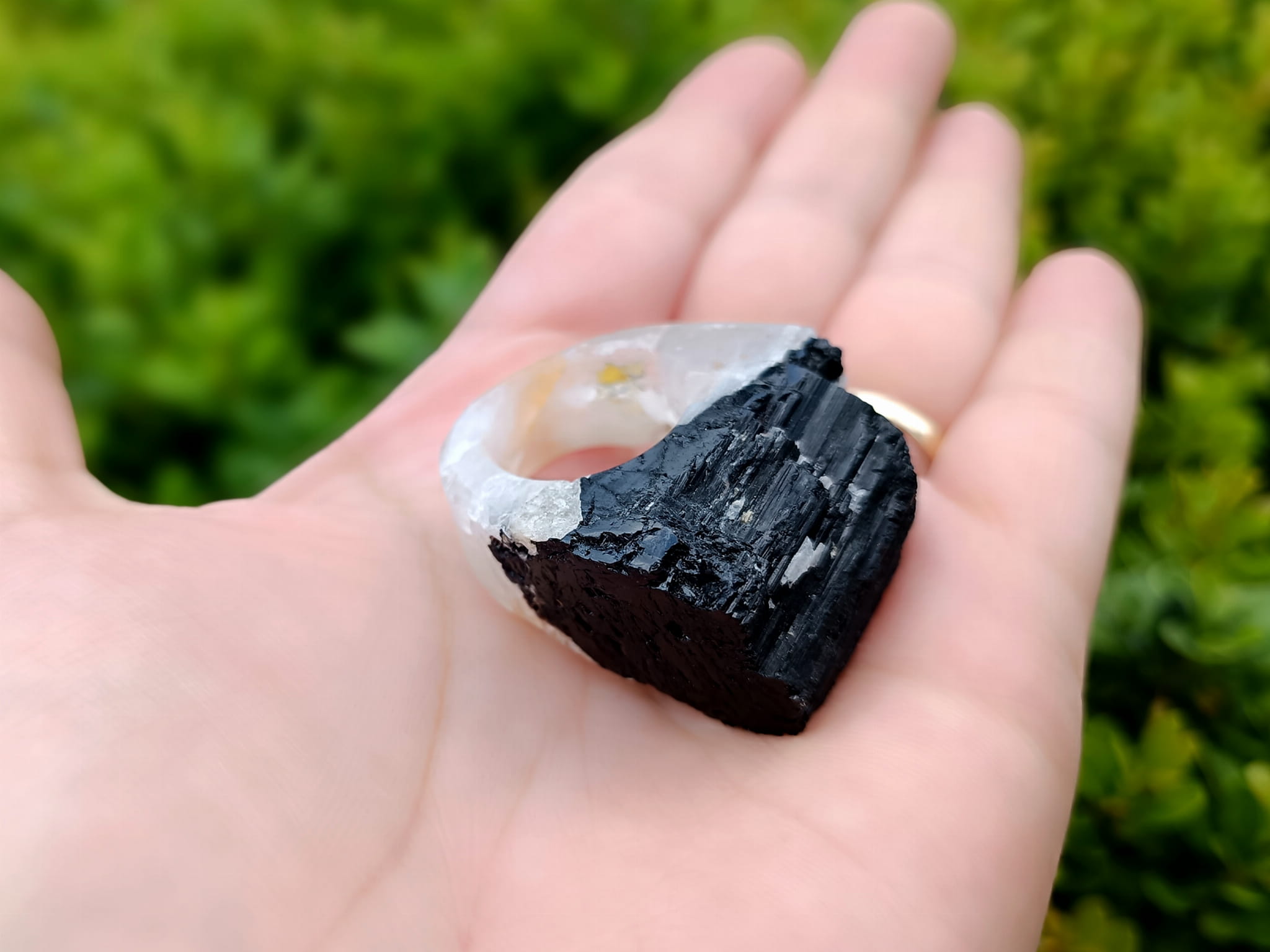 Elegancki pierścionek wykonany z jednego kawałka białego kwarcu turmalinowego, ozdobiony czarnym turmalinem, pochodzącym z malowniczej Brazylii. Idealnie sprawdzi się jako wyjątkowy dodatek do każdej stylizacji.