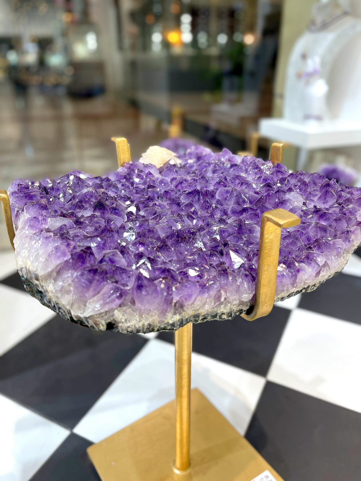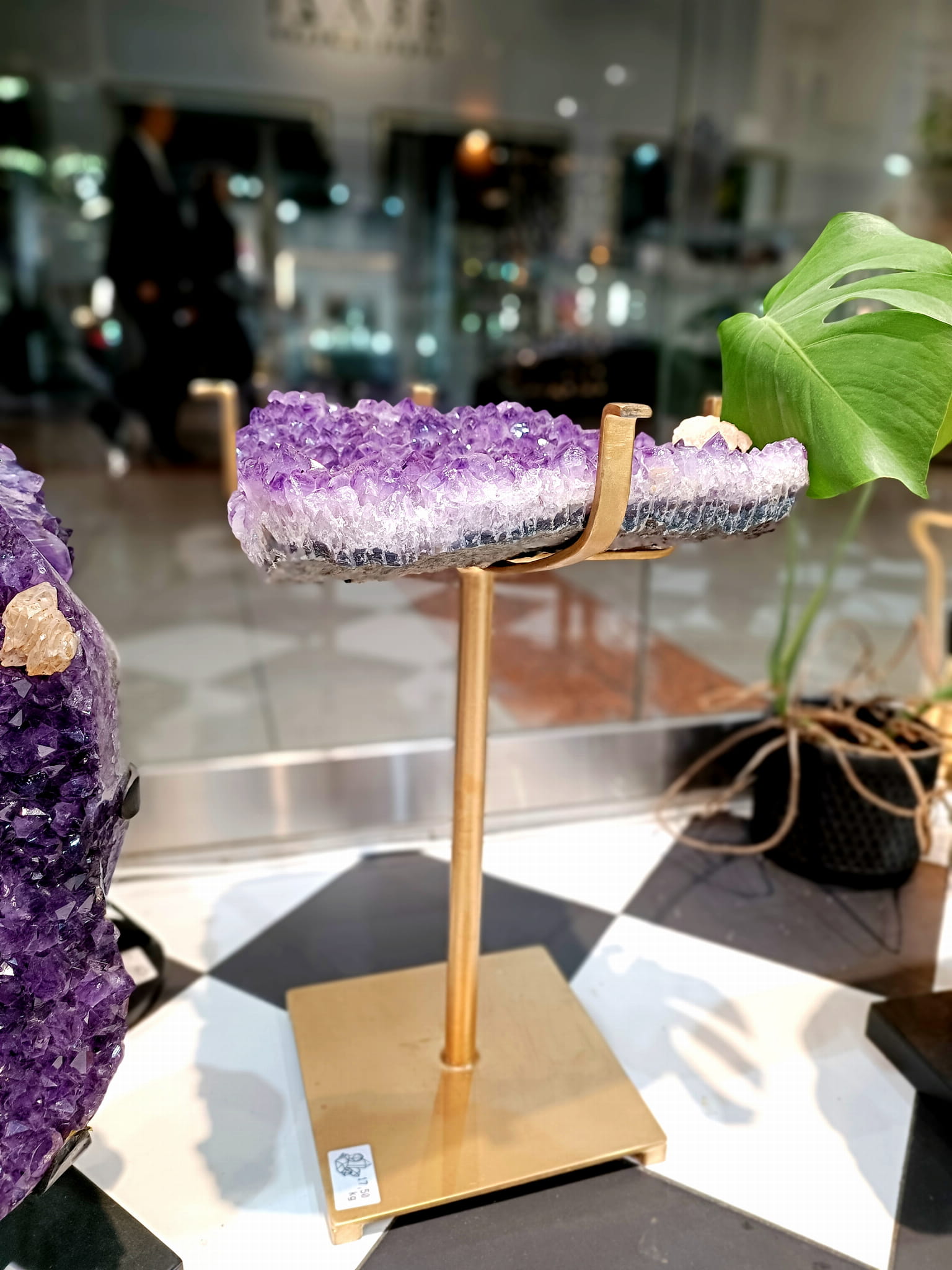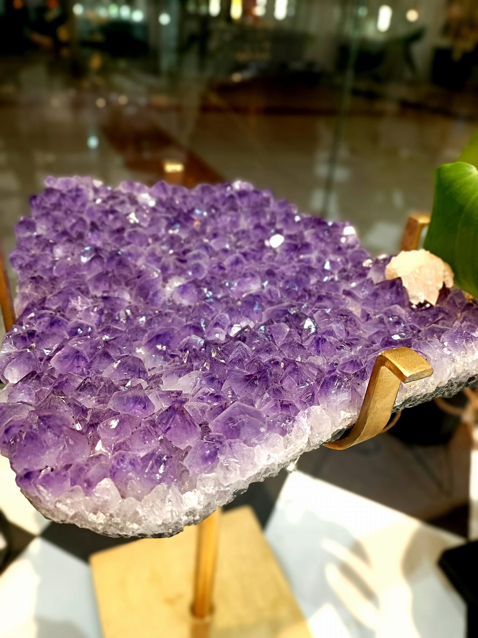 Odkryj prawdziwy klejnot wnętrzarski – niepowtarzalny stolik kawowy, którego sercem jest naturalna druza ametystowa, sprowadzona prosto z Brazylii. Ten wyjątkowy mebel zachwyca nie tylko surowym pięknem fioletowego ametystu, ale i mistrzowskim połączeniem natury z industrialnym designem. Nogi stołu w kolorze złotym idealnie komponują się z barwą kamienia i dodają eleganckiego charakteru.