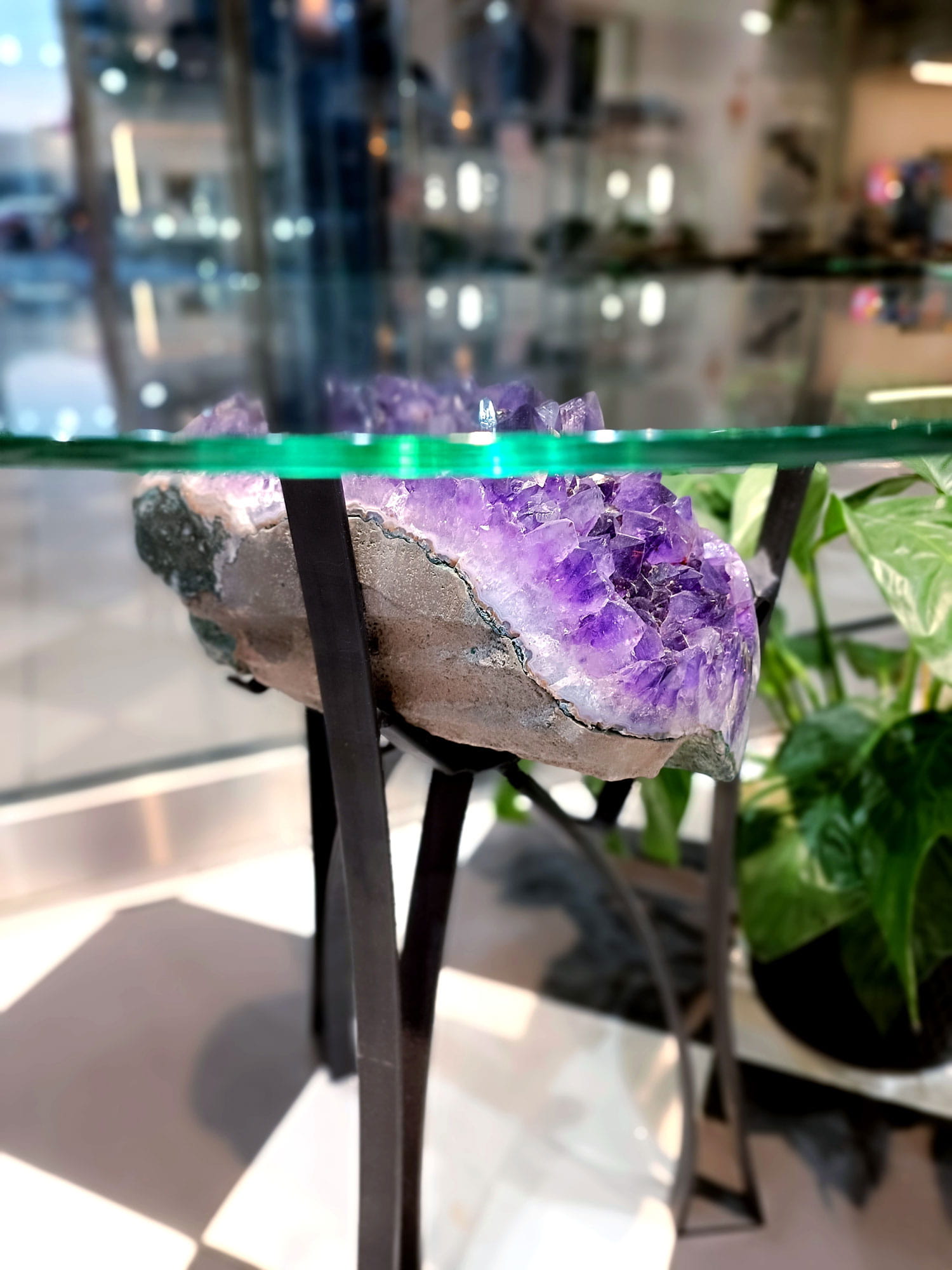 Odkryj prawdziwy klejnot wnętrzarski – niepowtarzalny stolik kawowy, którego sercem jest naturalna druza ametystowa, sprowadzona prosto z Brazylii. Ten wyjątkowy mebel zachwyca nie tylko surowym pięknem fioletowego ametystu, ale i mistrzowskim połączeniem natury z industrialnym designem.