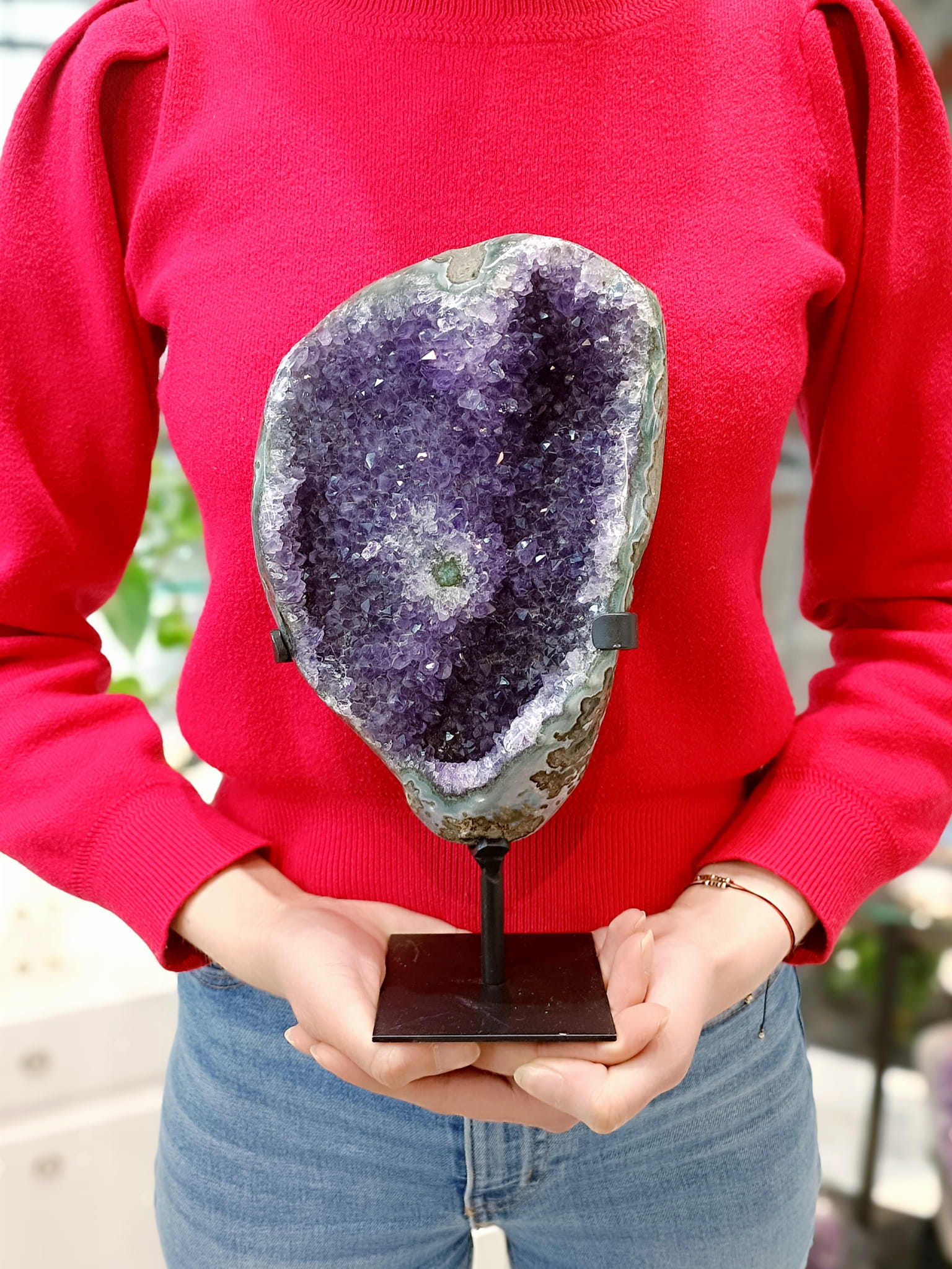Odkryj piękno naturalnego ametystu z wyjątkową szczotką na eleganckiej czarnej podstawce. Idealna jako dekoracja wnętrza, która wnosi harmonię i styl.