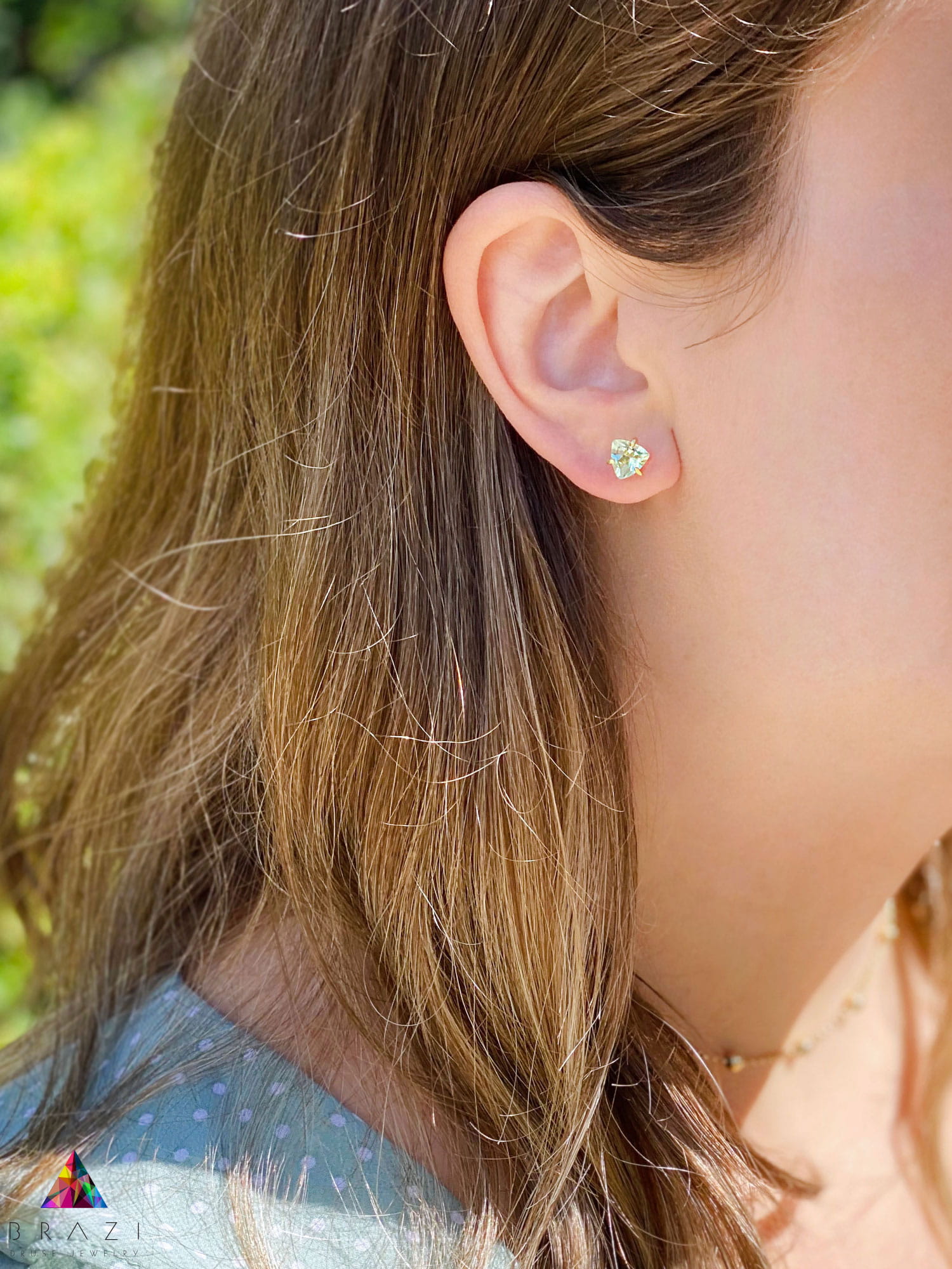 Odkryj subtelny urok kolczyków z prasiolitem, rzadką, zieloną odmianą ametystu, oprawioną w ciepłe 14-karatowe złoto (próba 585). Te minimalistyczne sztyfty, o szlifie trylion, emanują elegancją i naturalnym pięknem, stanowiąc doskonały dodatek do codziennych stylizacji. Każdy kamień, o wymiarach 7x7 mm i wadze 1,5 ct, został starannie wyselekcjonowany pod kątem jakości i precyzyjnie oszlifowany, aby wydobyć jego głęboki, zielony blask.