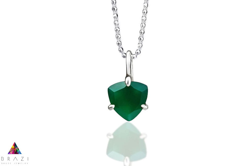 Odkryj subtelny urok naszyjnika z kolekcji Romantic Story, wykonanego ręcznie w Polsce z dbałością o każdy detal. Sercem tego wyjątkowego dodatku jest fasetowany chalcedon chromowy o szlifie trylion i wadze 4 ct, mieniący się delikatnym blaskiem. Oprawiony w srebro próby 925 (dostępne również srebro pozłacane 24-karatowym złotem lub złoto próby 585), tworzy harmonijną kompozycję, idealną dla kobiet ceniących minimalistyczną elegancję.
