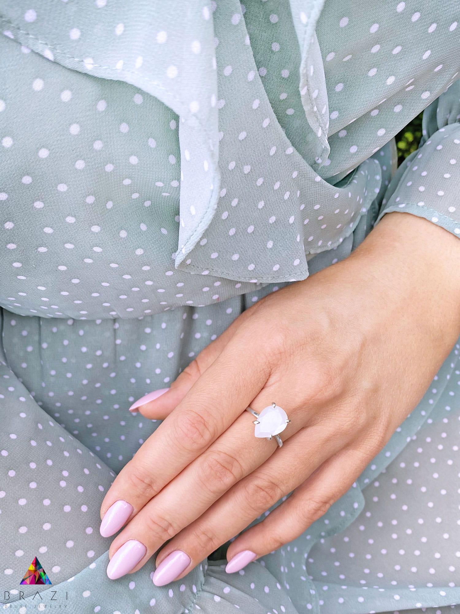 Zanurz się w subtelnym blasku naszego wyjątkowego pierścionka z kamieniem księżycowym, ręcznie wykonanego w Polsce. Ten elegancki dodatek, będący częścią kolekcji Romantic Story, to idealny prezent dla kobiety ceniącej delikatną biżuterię ręcznie robioną. Sześciokaratowy kamień księżycowy o szlifie kropli, starannie oszlifowany, uwalnia pełnię swojego magicznego blasku, przyciągając wzrok i dodając tajemniczości.
